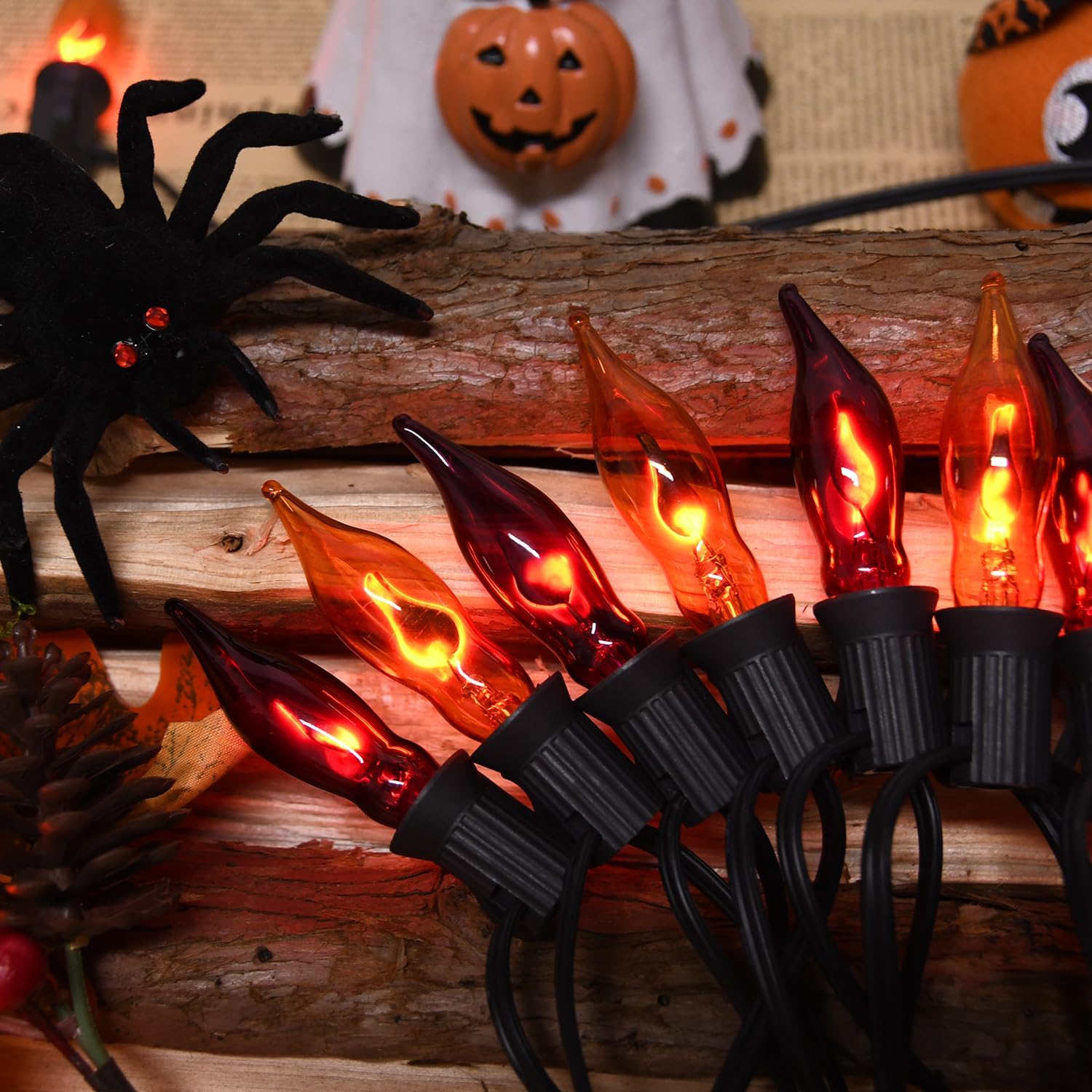 💡【Flame Lights Usage Parameters】 12.8Ft lenght per purple and orange Halloween lights-innovatively extended the male plug leads to 39.5” / 1 meter, and 12″ spacing between bulb, 6″ leads female plug, C7/E12 candelabra base, 10 flame bulbs per string, plus 1 orange flame bulb for replacement.