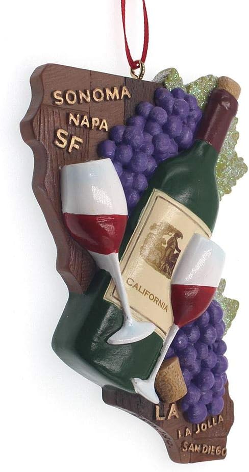 Our story begins after the close of World War II when Kurt Adler tried his hand at exporting general goods. As the business grew and European economies began to flourish, he changed direction to importing. Today, Kurt Adler remains a trusted company that has brought to life the memories of yesterday for millions of people. We are your one-stop source for all your holiday needs. California State Wine Ornament features a bottle of California red, two wine glasses, glittered grapes, and a cork adorning this ornament in the shape of California; Listed on the ornament are some wine country locatinos such as Sonoma, Napa, San Francisco, Los Angeles, La Jolla, and San Diego. Ornament is made of resin stone with grape purple finish; Hangs from red ribbon; Perfect for wine lovers. Decorative hanging figurine ornament measures approximately 4.25 inches tall; Perfect addition to your holiday décor or Christmas tree. Perfect for hanging display on a Christmas tree or ornament stand for the holidays. Ships in protective packaging.