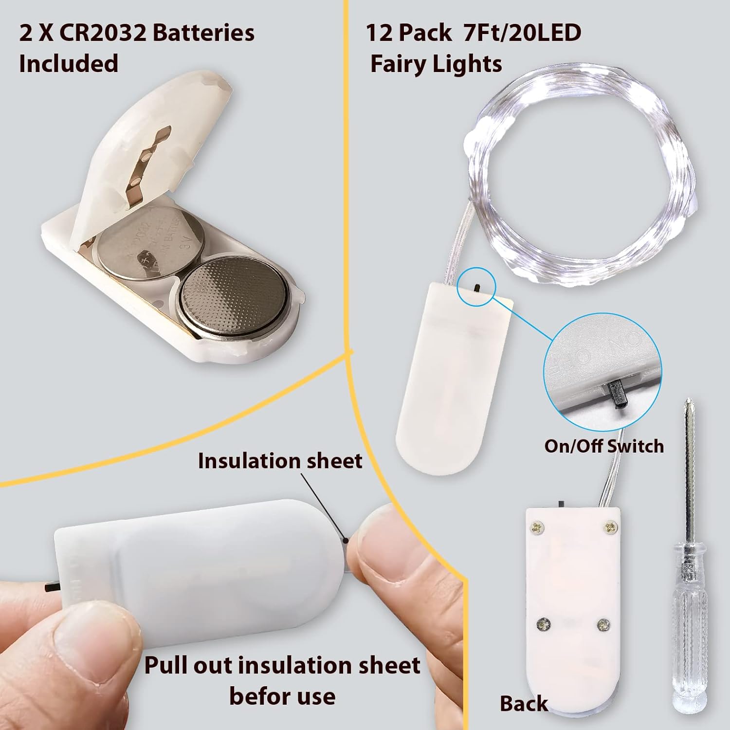 【Fantastic White Lights】: 12 separate mini fairy lights battery powered, made of 7ft high quality Silver coated copper wire, It’s flexible, strong and durable. Perfect for your crafts project , floral arrangements plants, signs, furniture glass jars, vases, wine bottles or other decorations.