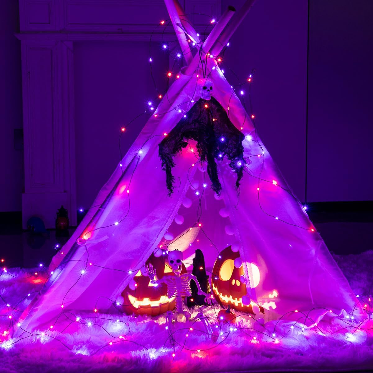 Purple and Orange Halloween String Lights: The halloween string lights is composed of 300 orange and purple LEDs . 100Ft flexible copper wires allow you to twist the lights into any shape or position you would want, be your own designer to shape it as you like.