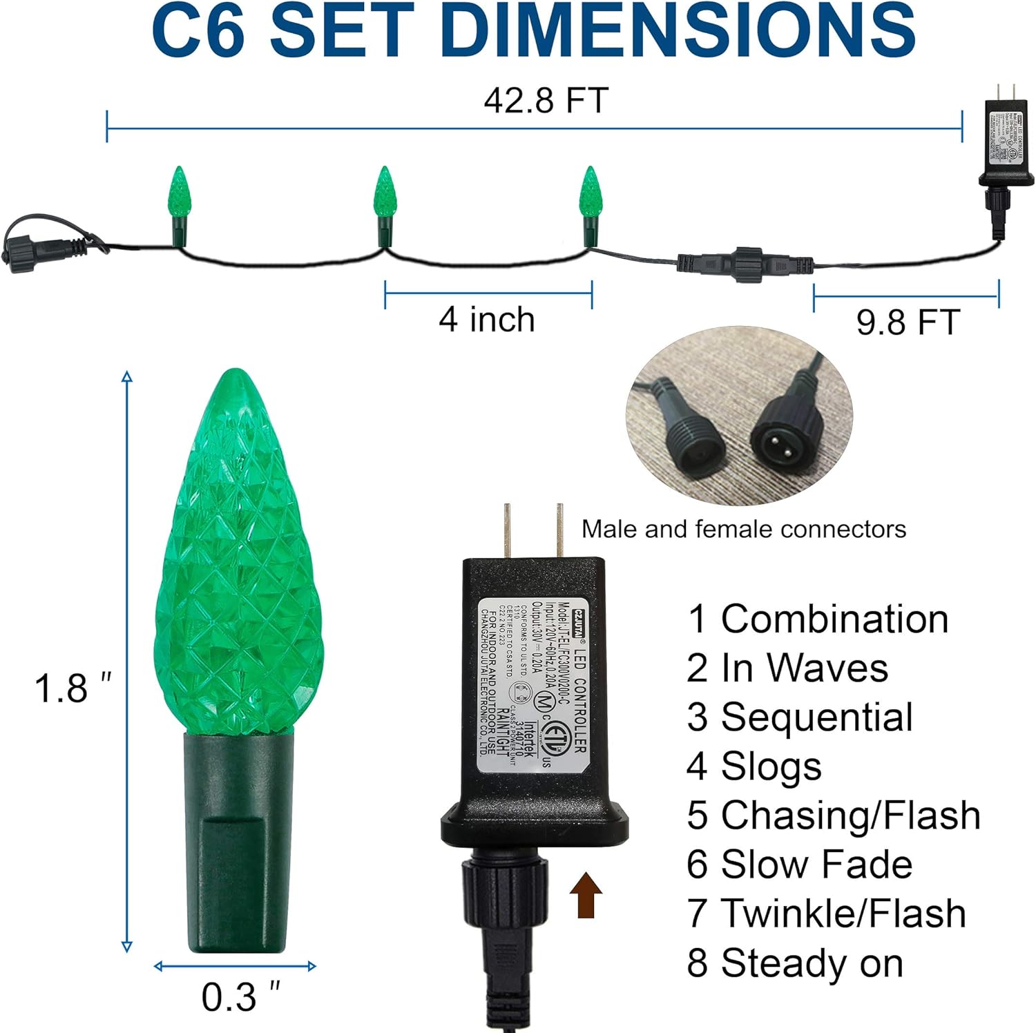 C6 Christmas Green Lights: Holiday decorating is easy with the 100 green LEDs C6 Christmas strawberry string lights, these are sure to bring brightness to your home. It comes with a super long 9.8 ft leading wire for convenient use. lights string: 33ft, total length: 42.8ft.