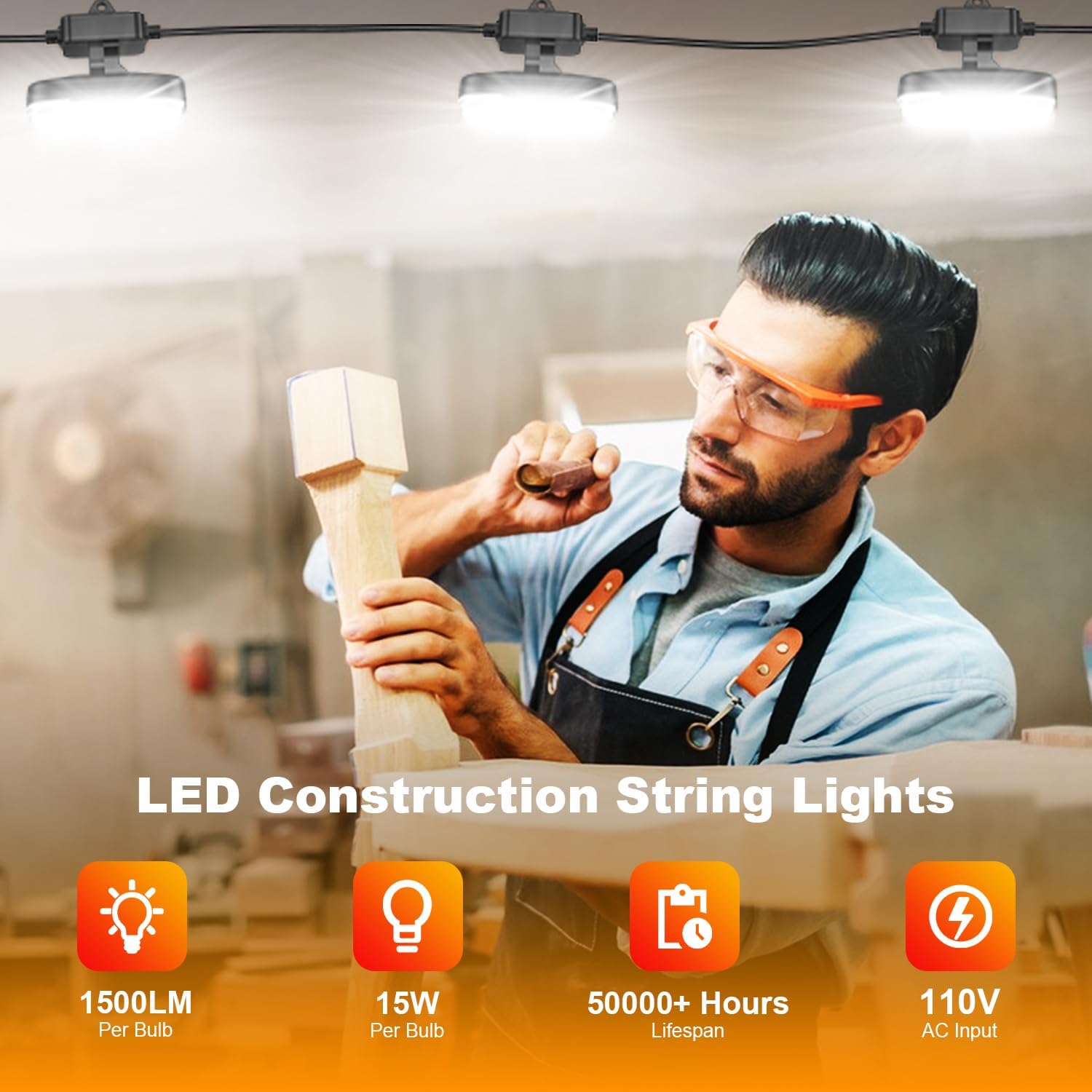 【High Brightness & Energy Saving】- Our LED Construction String Lights is equipped with high-quality LED chips, the brightness reaches an amazing 15000LM, which can save up to 80% of electricity