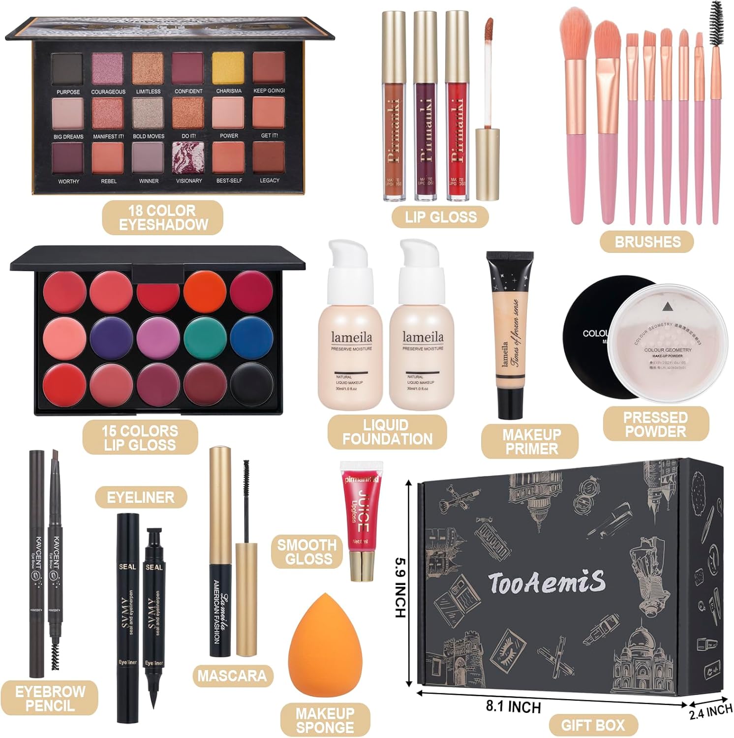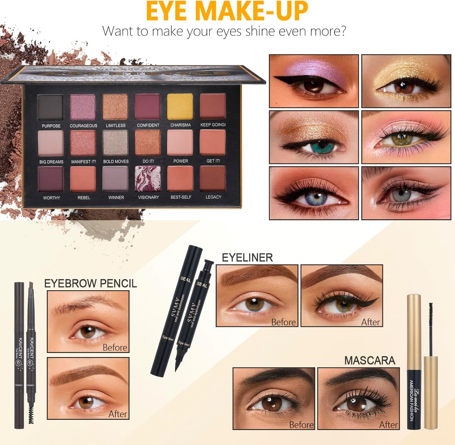 【All In One Makeup Set】A perfect starter makeup kit that includes eyeshadow palette, loose powder, lipgloss, lipstick, concealer cream, makeup brush, concealer palette, eyebrow powder, high-gloss lying silkworm brightening powder, concealer, eyeliner, lip balm, mascara, foundation, powder puff, travel bag. All women’s essentials in one elegant box and a great gift for any occasion.