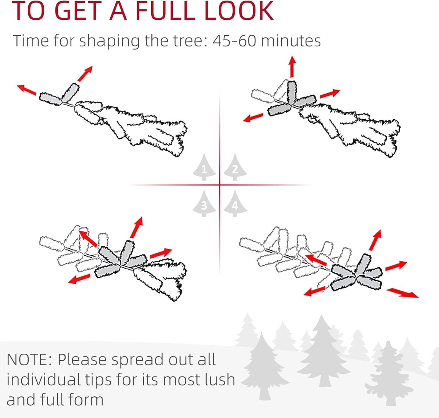 Colour Green Light colour Warm White Material Plastic, Steel Overall Dimension ⌀44.5″ x 88.6″ H (⌀113 x 225cm) Tree Height 7.5 ft Cord Length 9.2 ft Tip Count 1188 Light Count 500(LED) Input 120 V, 60 Hz Output 30 V, 6 W Item Label 830-774V81GN Note Only for indoor use, not for outdoor Note In order to get a full appearance, please spread out all individual tips to get a great possible look from the tree, suggest you to take 45-60 minutes to shape the tree.