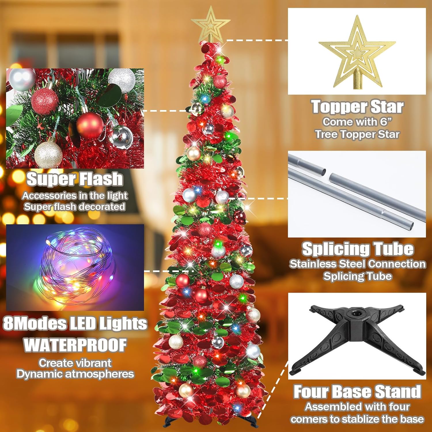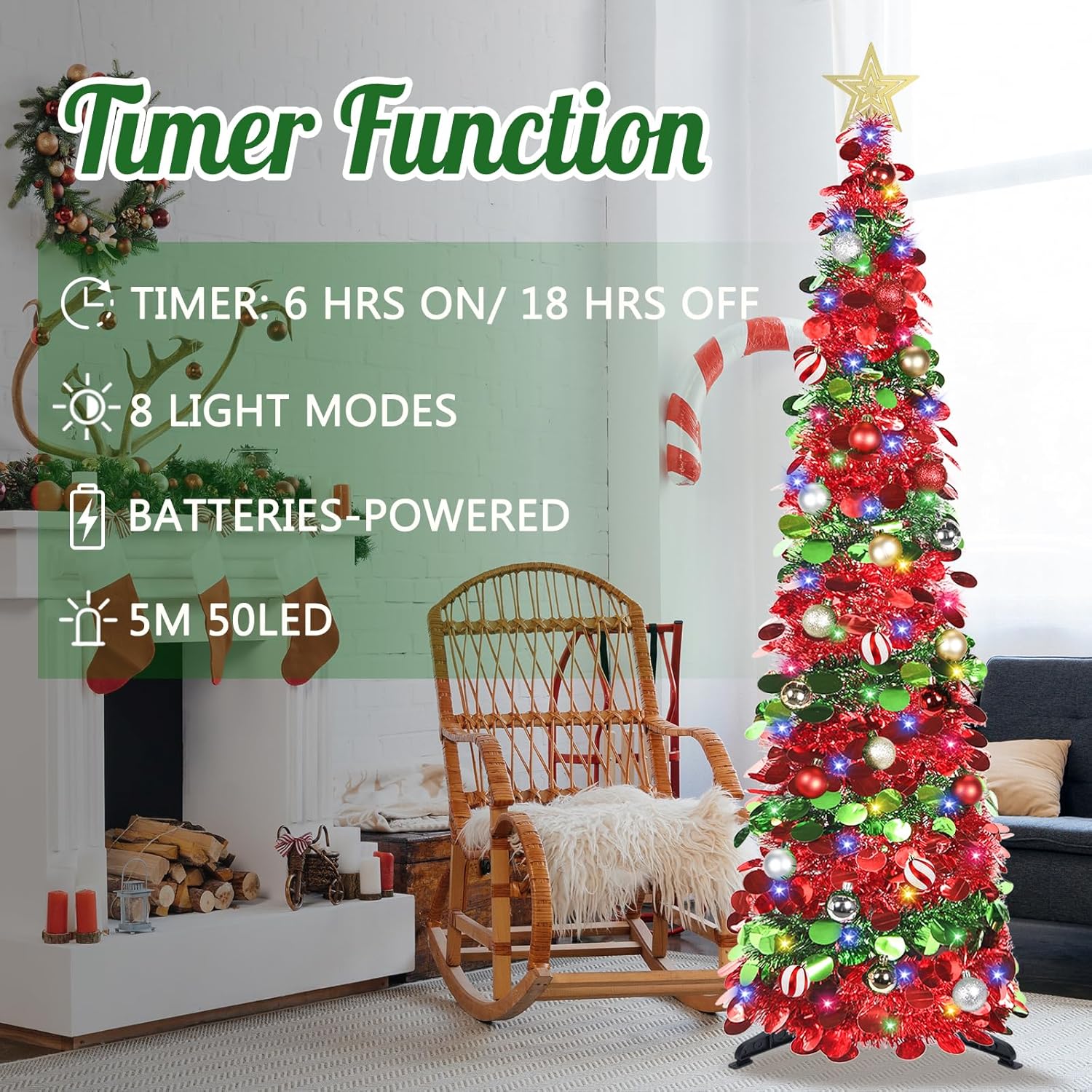SINTENILL 5 FT Pop Up Christmas Tree with Timer Lights and Decorations, Red Green Christmas Tinsel Tree with 24 Ball Ornaments, Pencil Tree Collapsible Christmas Tree for Home, Apartment, Office