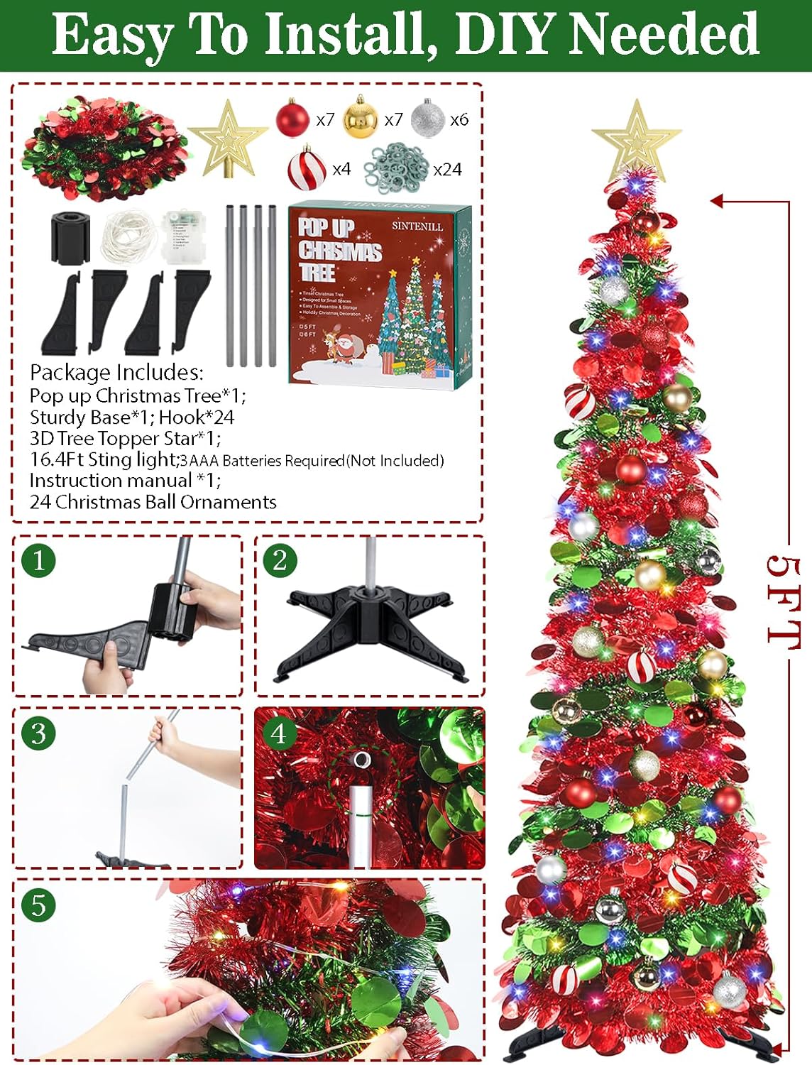 POP UP TINSEL CHRISTMAS TREE WITH LIGHTS AND DECORATIONS: SINTENILL 5FT Christmas Tree combines retro tinsel charm with modern convenience. The pencil-thin silhouette wrapped in shimmering tinsel with 50 LED colored light, 24 glittering ball ornaments and a 3 D star topper, this space-saving tree creates instant holiday magic. Perfect for tight spaces yet makes a bold decorative statement. Sparkling Festive Centerpiece in Minutes