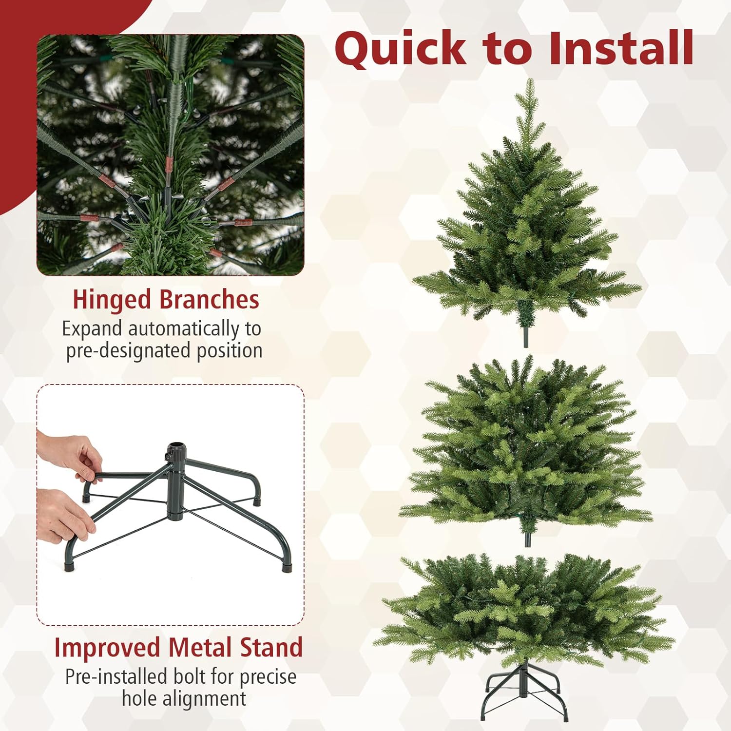 Easy Installation & Storage – The artificial Christmas tree adopts convenient hinged structures, which can help branches automatically spread out, saving labor and time. Moreover, thanks to the 3-section design, the tree can be stored in a compact size when the season is over.
