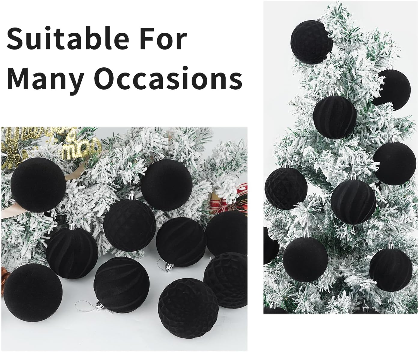 Package List: the package contains 15 pieces of flocked Christmas ball ornaments, measuring approx. 3.15 inches in diameter, featuring black, sufficient quantity, classic styles, and nice texture can fully meet your needs for decorating and sharing