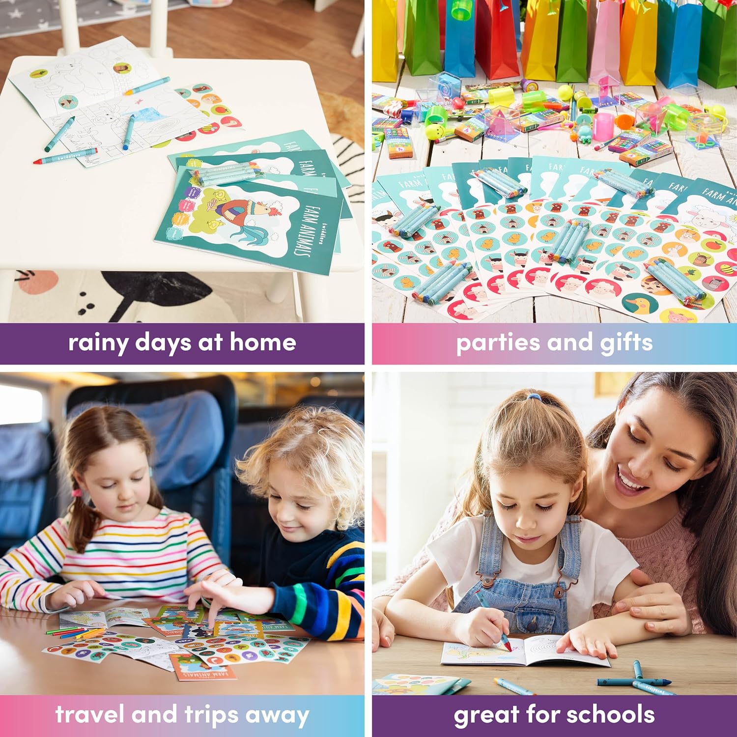🐔 VIBRANT COLORING PARTY – Our mini coloring book party favor package comes with 12 packs of a complete drawing set. Each pack includes 16 funny illustrations e.g. cow, pig, hen, horse, rabbit, dog, sheep, duck, donkey (192 in total), 4 vibrant crayons (48 in total), and 18 learning stickers (216 in total). These vibrant coloring books provide a fun-filled activity for kids at parties or events.