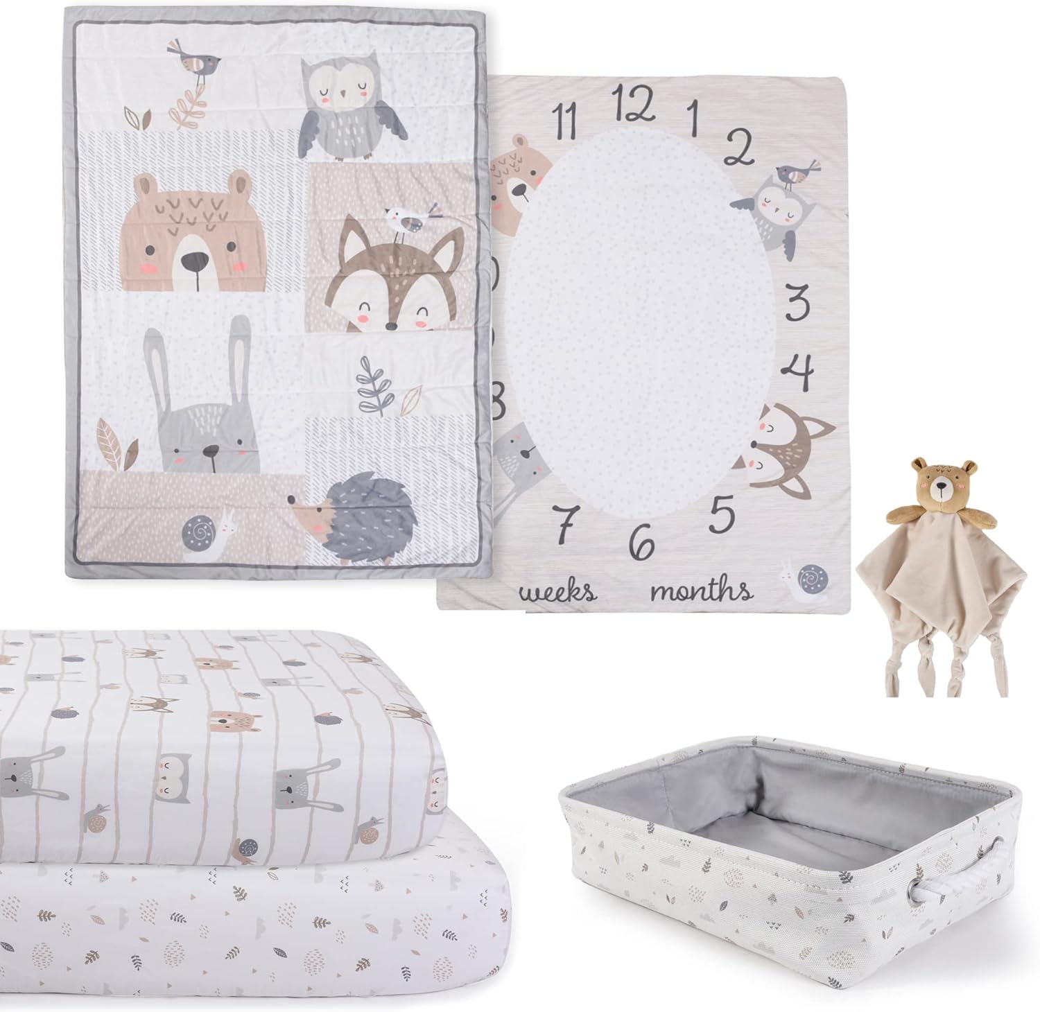 ♥ 5-Piece Nursery Bedding Bundle – All-in-One Baby Room Essential! Create the perfect cozy and stylish nursery with this premium 5-piece baby bedding set, designed to provide comfort, convenience, and cuteness! This all-in-one bundle includes a reversible milestone blanket (30×40″), 2 ultra-soft crib sheets (28×52+8″), an adorable baby buddy (12×12″), and a matching storage tote (15x11x4″) —everything you need for a beautifully coordinated nursery.