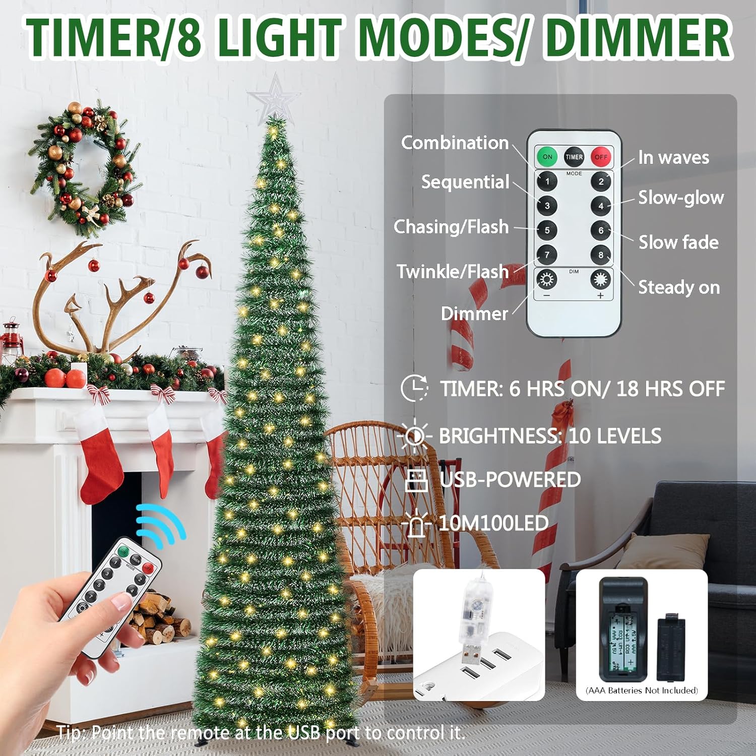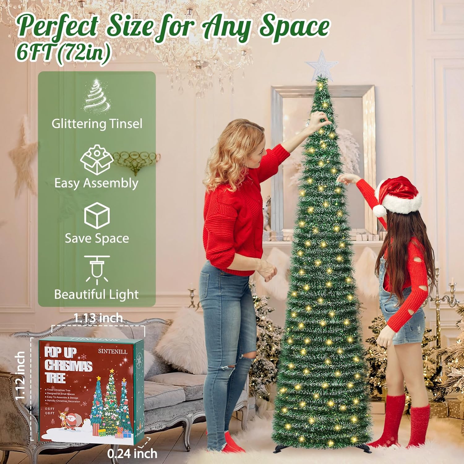 POP UP TINSEL CHRISTMAS TREE WITH LIGHTS: SINTENILL 6FT Christmas Tree combines retro tinsel charm with modern convenience. The pencil-thin silhouette wrapped in shimmering tinsel with 100 LED lights, creating a sparkling ambiance that captures the festive spirit. this space-saving tree creates instant holiday magic, perfect for tight spaces yet makes a bold decorative statement
