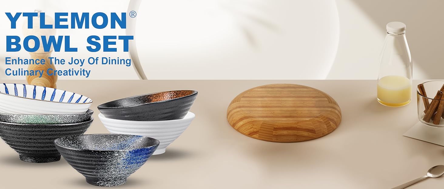 HUGE CAPACITY: YTLEMON Ramen Bowl Set contains 2 ceramic bowl of 1800ml/60oz capacity, 2 wooden Forks and ramen spoons, 2 pairs of wooden chopsticks.Each pasta bowl measures 23.8 cm/9 inches in diameter and 9.5 cm/3.74inches in height. Comes with 1000DAYS electronic ramen cookbook for you