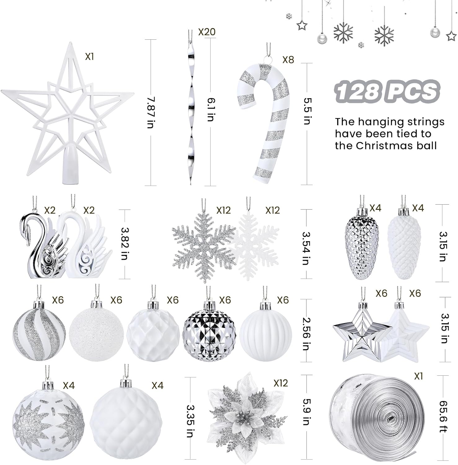 Alupssuc 128pcs Christmas Balls Ornaments Set, Shatterproof Plastic Baubles Christmas Flowers, Ribbon,Tree Topper for Xmas Tree Holiday Wedding Party Decorations with Hanging Strings, White and Silver