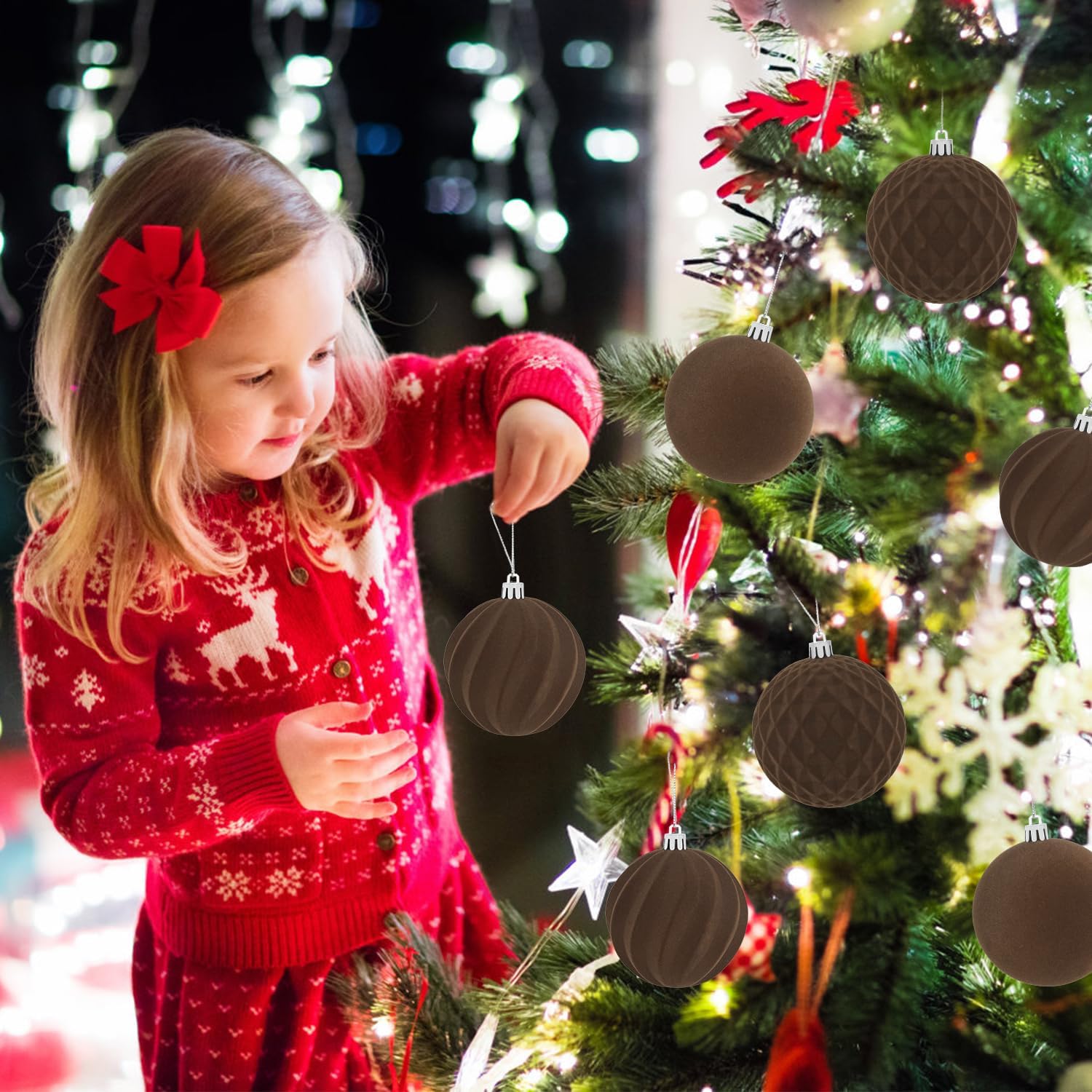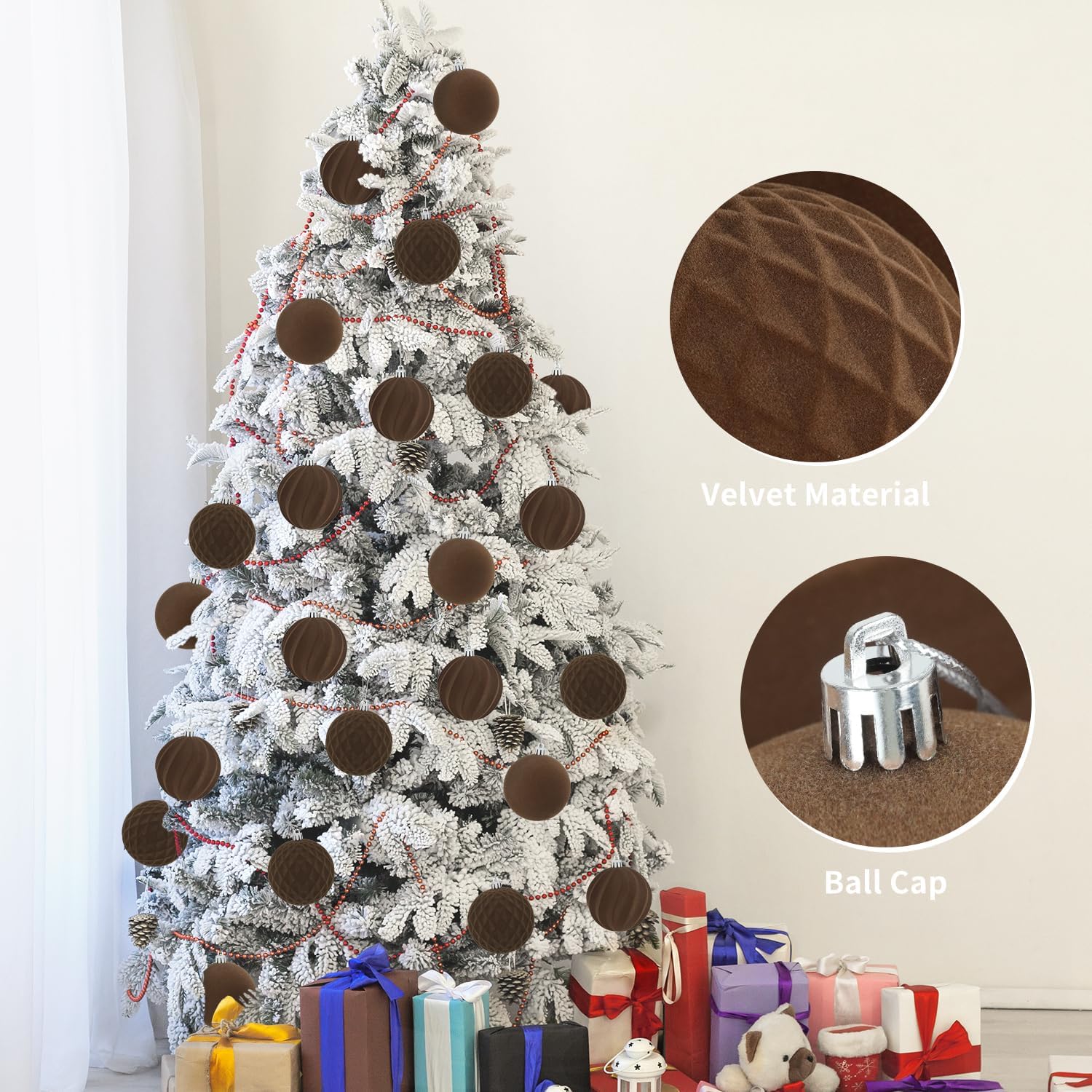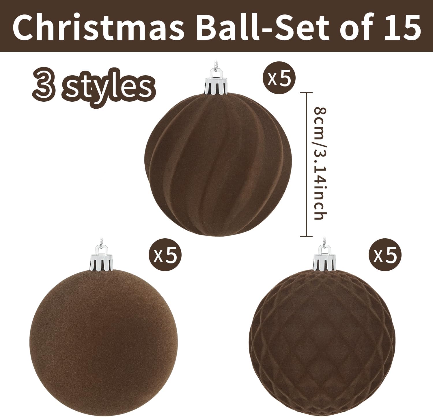 Package List: the package contains 15 pieces of flocked Christmas ball ornaments, measuring approx. 3.15 inches in diameter, featuring brown, sufficient quantity, classic styles, and nice texture can fully meet your needs for decorating and sharing