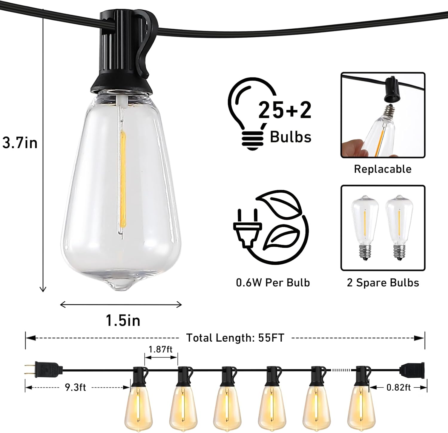 【1.87FT Bulb Spacing】The 55FT outdoor string light features 9.3ft long lead cord for easy access to power outlet. It also saves you the trouble of purchasing extra extension cord. Every two adjacent bulbs are 1.87ft apart, proper spacing to decorate either large or small space.