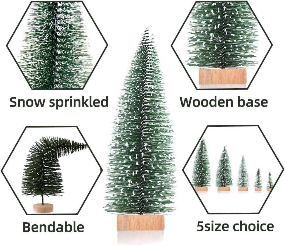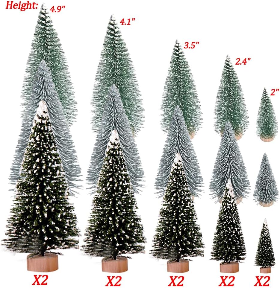 🎄【QUANTITY & SIZE】—Each pack contains 30 Christmas trees frosted with artificial snow, all the mini sisal tabletop trees are in 5 different size,2in/5cm,2.4in/6cm,3.5in/9cm,4.1in/10.5cm,4.9in/12.5cm (bottom of tree base to top of tree).