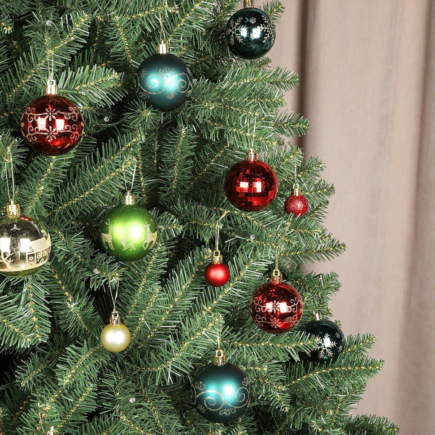【Two Sizes, Rich Finishes】Includes ornaments in two versatile sizes: 1.18″ and 2.36″. A mix of matte, glossy, and glitter finishes in classic red, green, and gold creates depth and sparkle, giving your tree a warm, elegant glow