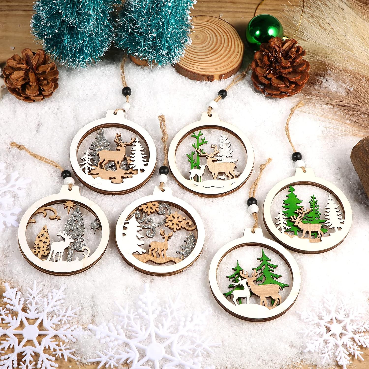 Farmhouse Christmas Ornaments Set, 6pcs Christmas Hanging Reindeer Wooden Rustic Pendant Reindeer Decor for Winter Christmas Holiday Tree Decorations