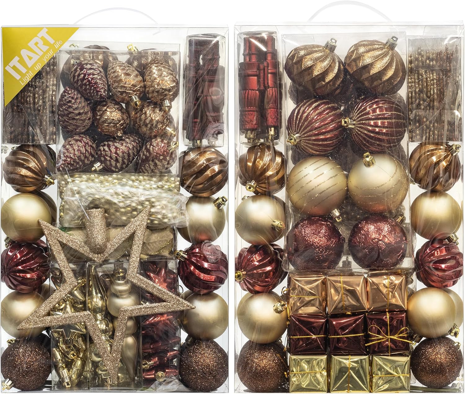 This exquisite ITART Christmas Tree Ornaments include tree topper, Christmas balls, large snowflakes, nutcracker figurines, pine cones, finial drops, miniature gifts, poinsettia, beaded garlands. Make Christmas decor special with the perfect Christmas ornaments to adorn your tree in the holiday season. Classic and vintage tree decor!