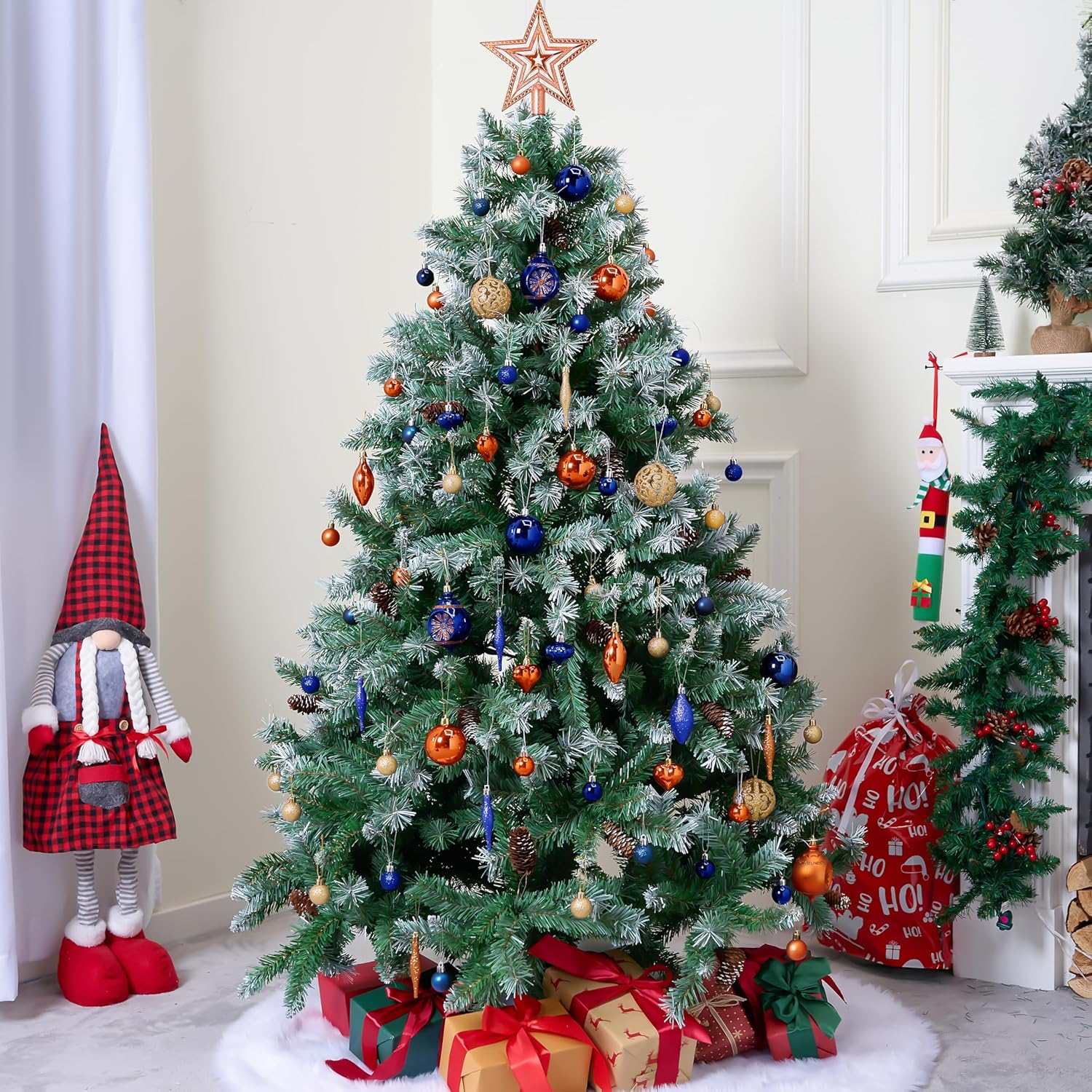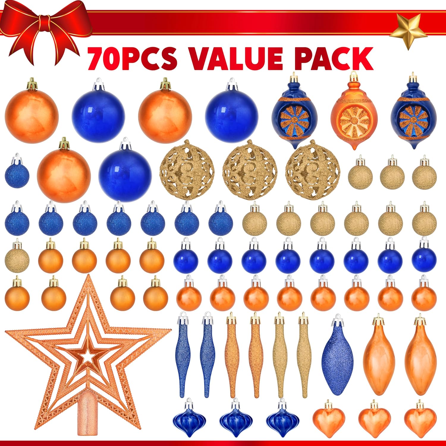 SUPER VALUE PACK. Our Fantastic Christmas Decorations Includes 1 Star Tree Topper,3 Footballs, 6 Glitter Icicles,3 Bubbles,9 Orange Gold Shiny Balls, 6 Orange Gold Matte Balls, 9 Blue Matte Balls, 6 Blue Shiny Balls,6 Blue Glitter Balls,12 Orange Gold Glitter Balls,3 Orange Gold Heart,3 Glitter Hollow Pattern Balls,3 Blue Stripe Shiny Balls.Each Color Is Bright And Beautiful And Perfect For Christmas Indoor And Outdoor Decorations!