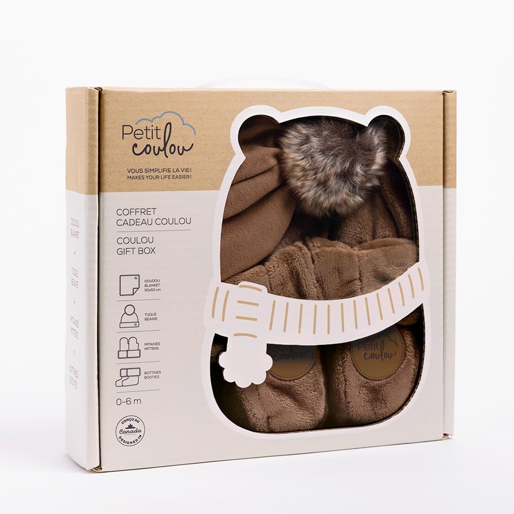 This 4-piece gift set includes a cute pair of baby booties, a pom-pom winter hat, a soft baby blanket and a pair of mittens. Fit newborns up to 6 months.