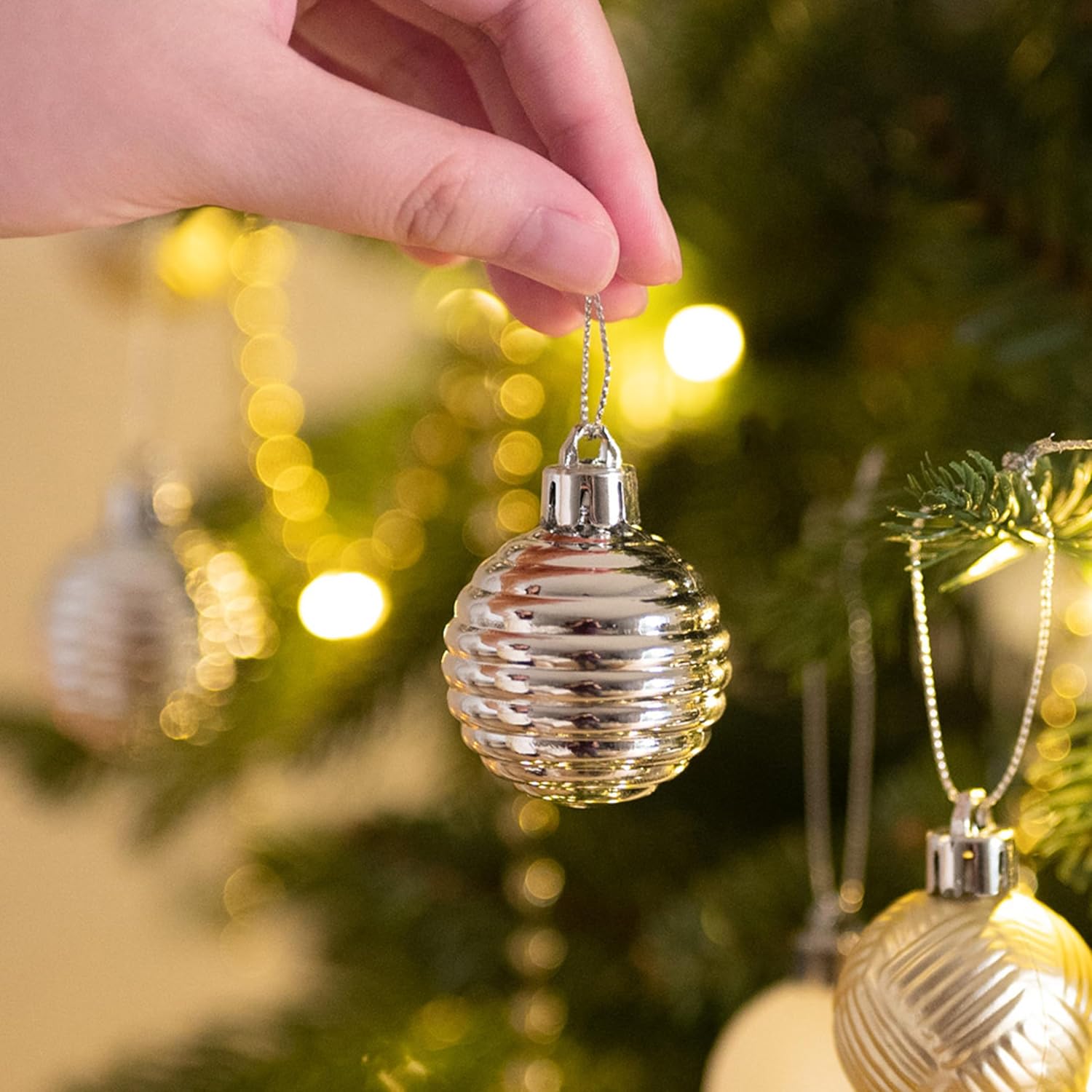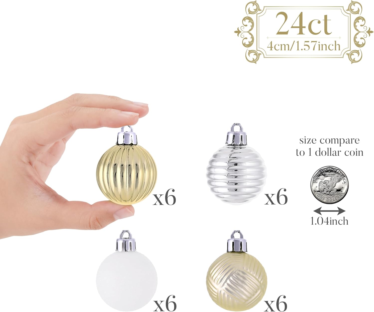 【Packaging and Size】The ball set includes 24 white and gold Christmas ornaments, each measuring 1.57 inches, and featuring seamless connections for a polished look.
