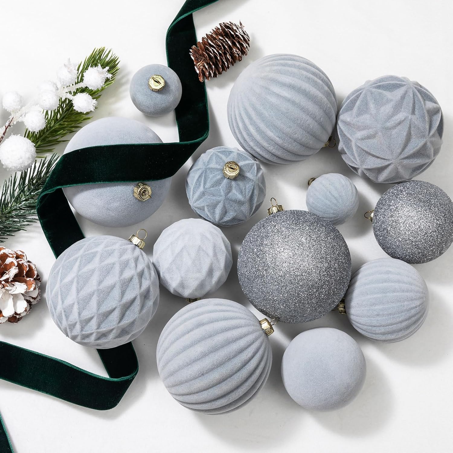 Unique Velvet Texture: Our ornaments stand out with their unique velvet texture and classic grey christmas hues. Includes 18pcs small(1.57″/40mm), 12pcs medium(2.36″/60mm) and 6pcs large(3.16″/80mm)ball ornaments, the subtle elegance of these pieces makes them a versatile choice for any holiday theme.