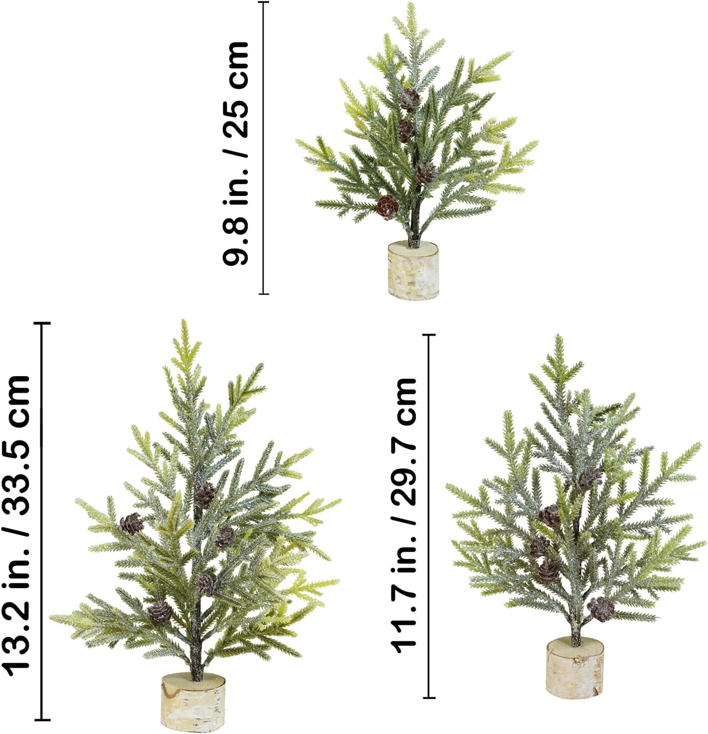 Ring in the holiday season with the beautiful trio of artificial Christmas trees. These faux pine trees are frosted for a little glitz and shimmer. Perfect for adding lifelike greenery to your small space, these decorative tabletop trees will deck up your mantel, office desk, shelves, windowsill, coffee table, entryway, end table, kitchen island, breakfast nook and more. Idea for your Christmas party table, winter wedding, woodland theme party, and other holiday occasion.