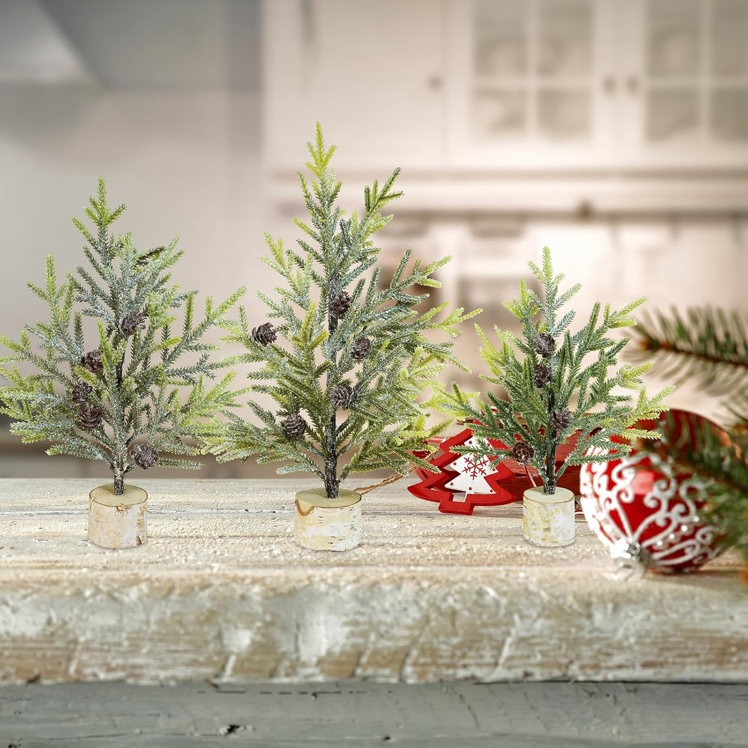 Quantity: Package includes 3 pcs artificial mini frosted pine trees tabletop Christmas trees in 3 sizes. Each tree comes fixed in a natural wood stump base for easy placement on any flat surface. These faux cypress pine trees consist of full-bodied and realistic branch tips with mini pine cones, you can fluff out the tips to create the desired full effect. Display these mini Christmas trees together to create a centerpiece for added holiday cheer.