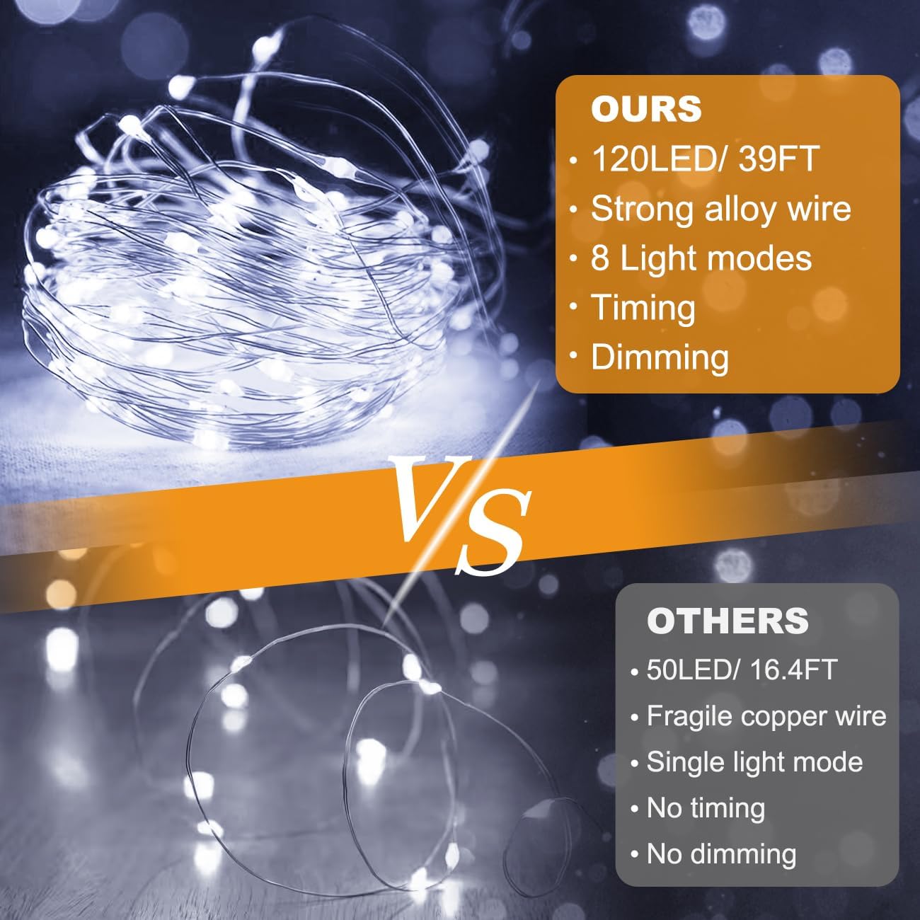 【Attractive Fairy Lights】High quality materials, soft and easy to shape. 2*120LED, 2*39FT long, fairy light meets your decoration needs. LED fairy lights can be used to decorate Christmas trees, bedrooms, weddings, queues, photo walls, flowers, bottles and more. Fairy lights plug in bring a warm atmosphere