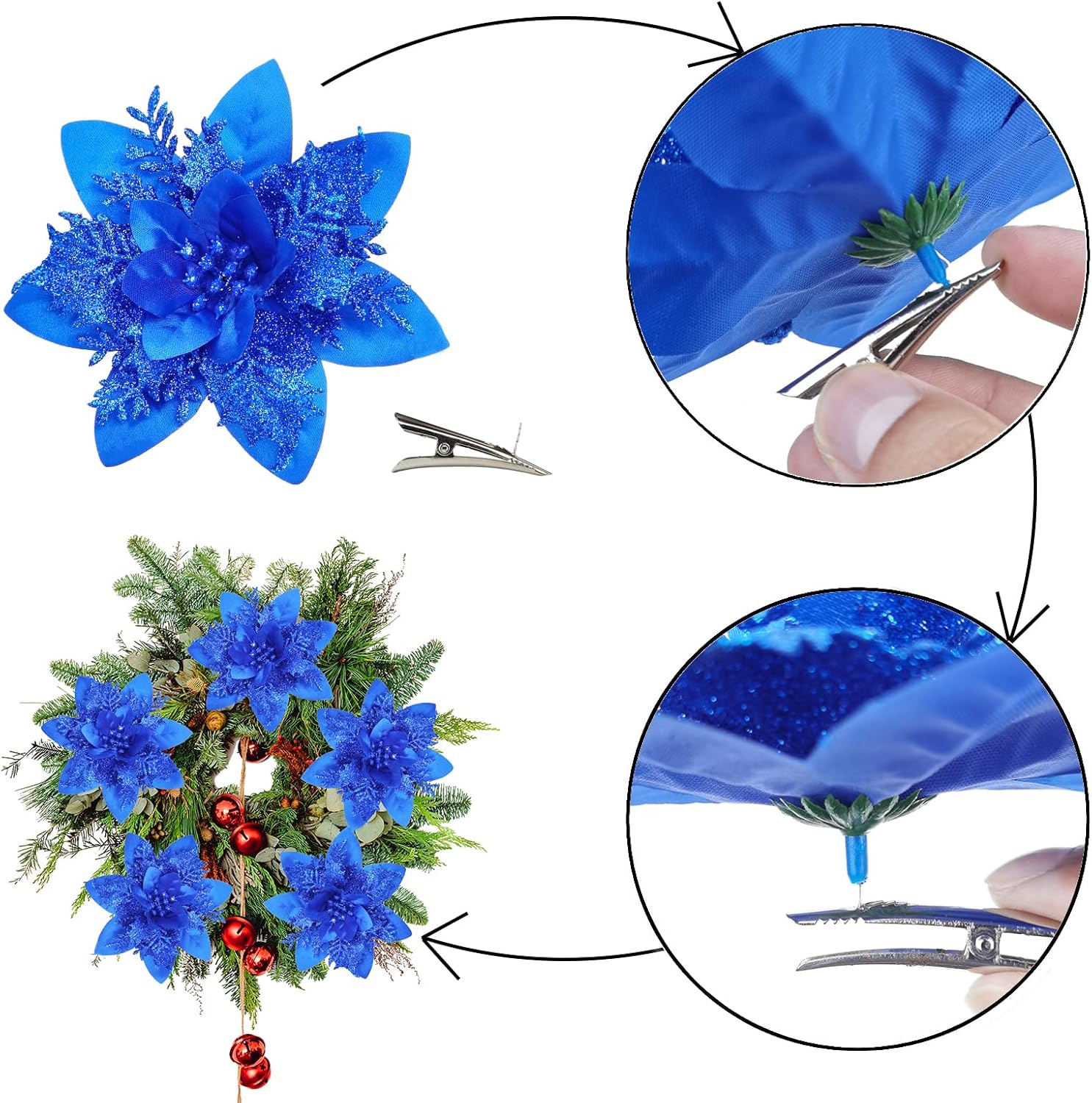 EASY TO DECORATE: We provide 20pcs 4.5cm clips which are bigger and easier to decorate Christmas artificial flowers. Insert the base of the flower into the tip of the clip. You could decorate the MIKAILE artificial Christmas flowers in any place as you like. Never worry about not finding the accessories to fix them.