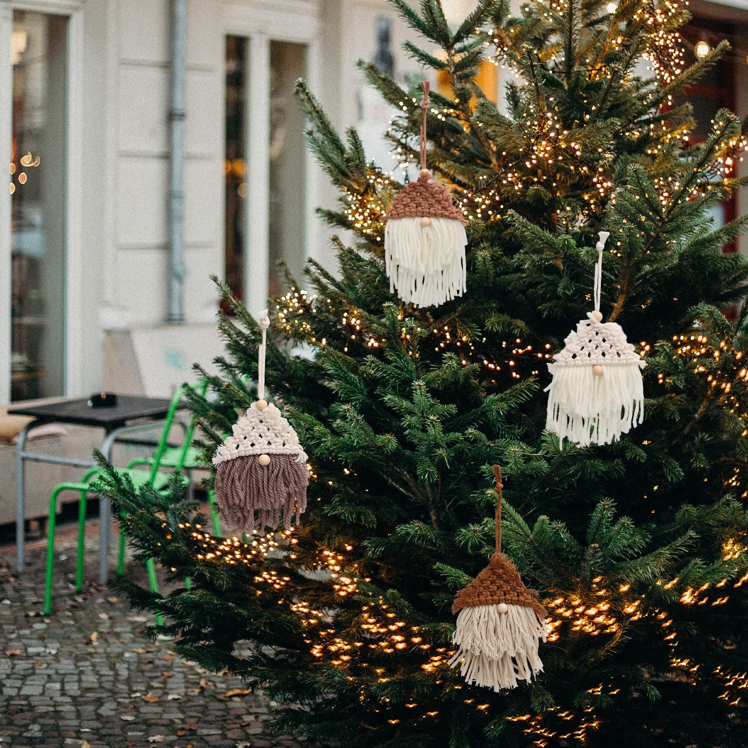 4pcs Hand Knitted Christmas Gnome Macrame Ornaments, Boho Christmas Decorations Knitting Gnome Christmas Tree Hanging Ornaments Farmhouse Xmas Decor for Indoor Outdoor Home Xmas Tree Wall