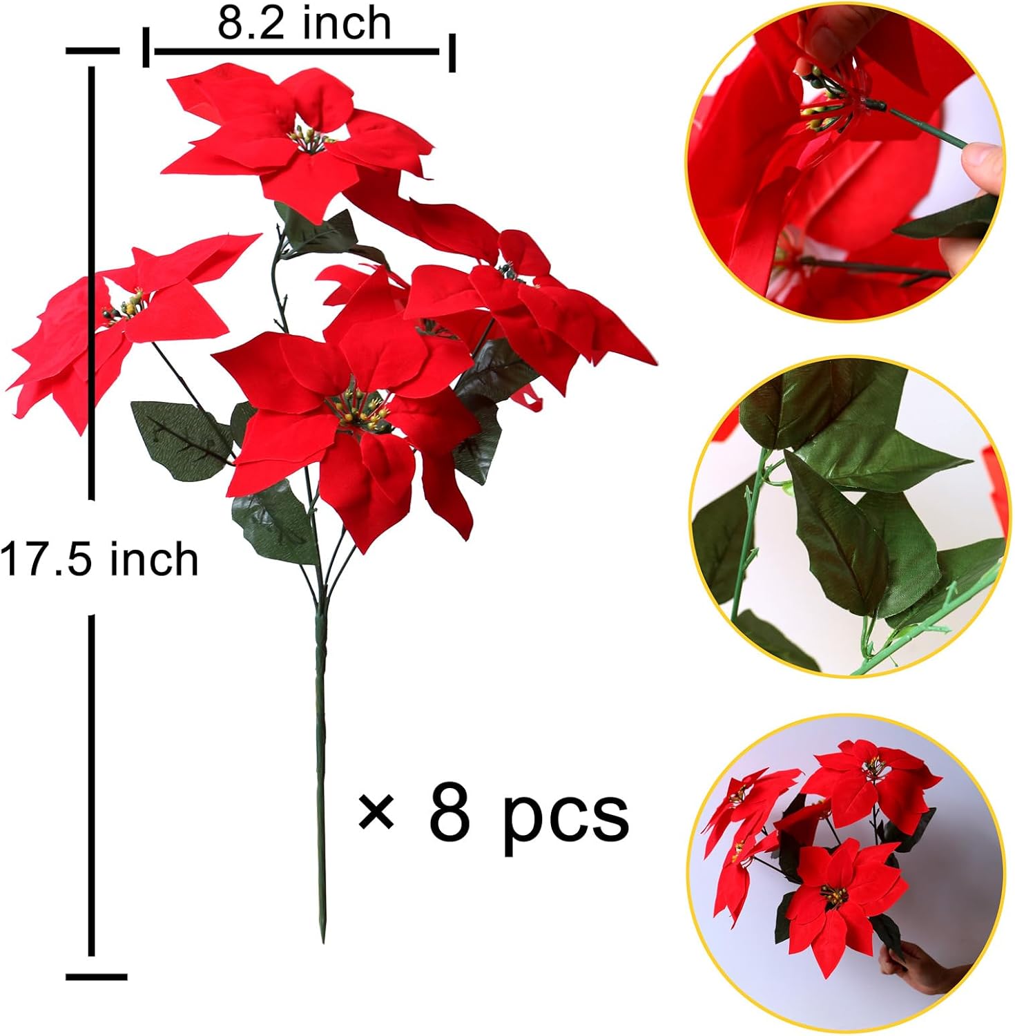 Package Includes 8pcs Artificial Poinsettia Flowers Bouquets(5 stems/per) with 40pcs Red Poinsettia Flowers in total(5pcs/per bouquet). Length: about 17.7 inch; flower head diameter about: 20cm/8.2inch.