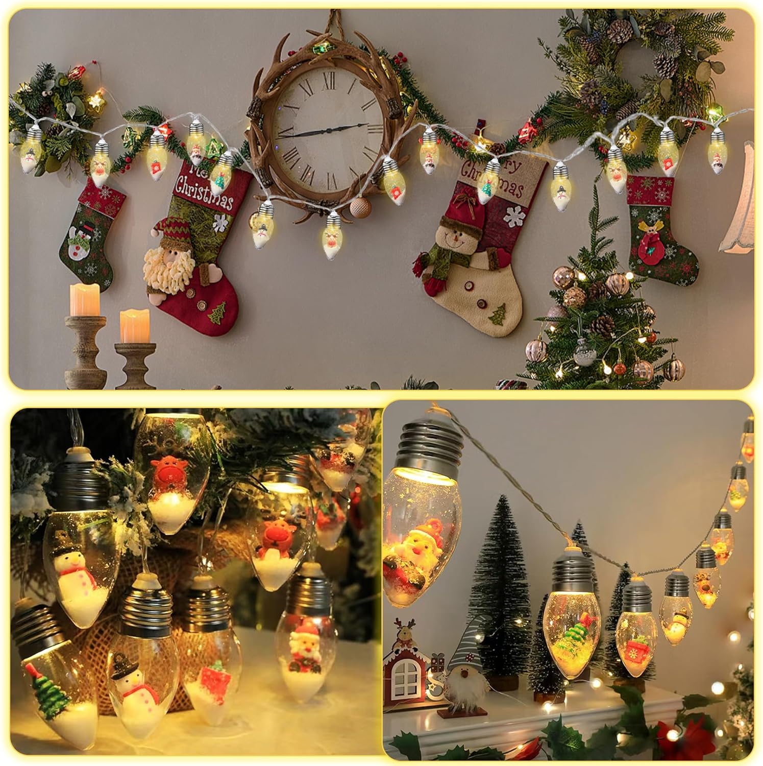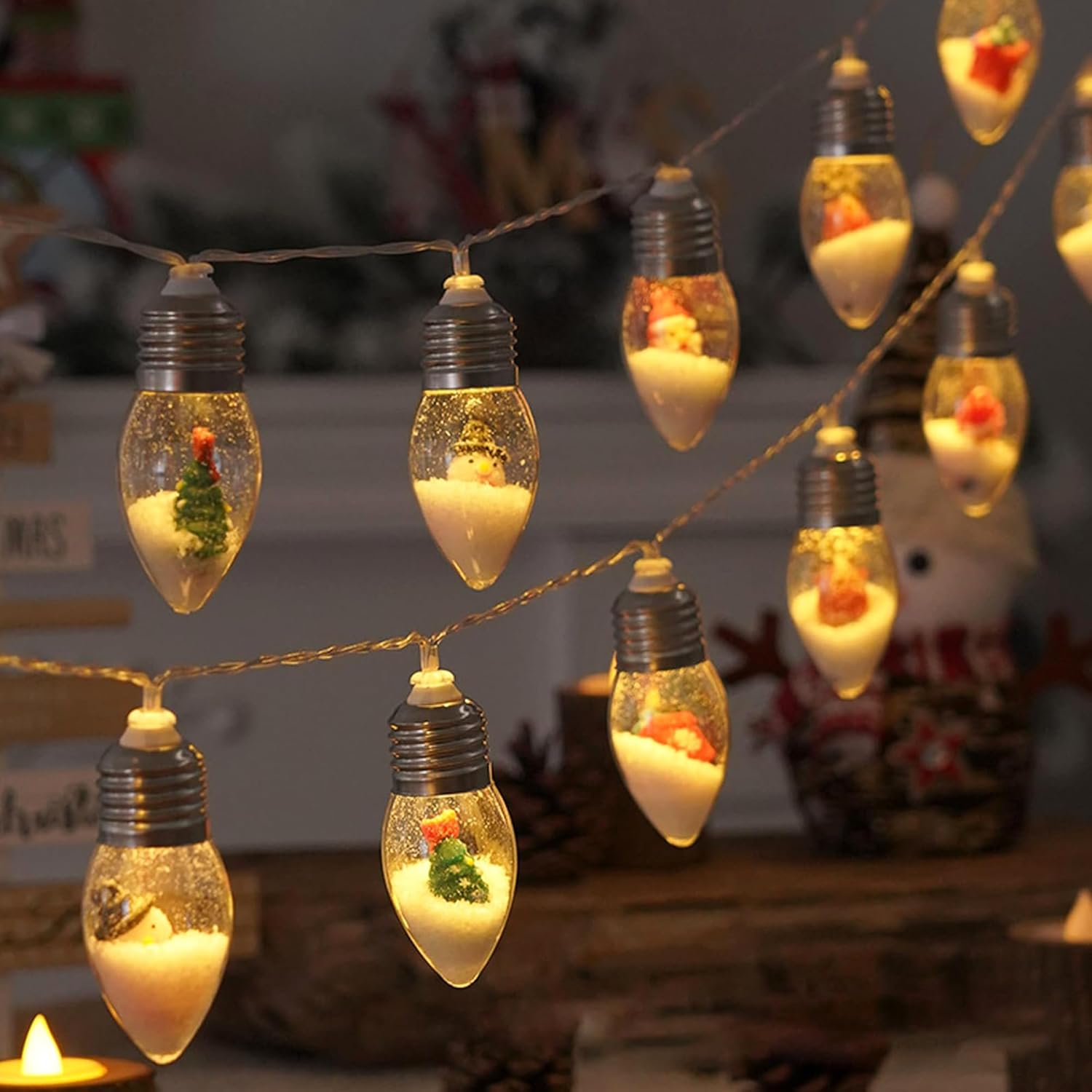 🎄【Vintage Christmas Decor】These charming snow globe battery-operated Christmas lights are the perfect festive decoration. Each bulb is filled with delicate artificial pine branches, snowflakes, and adorable ornaments. Ideal for bedrooms, mantels, windows, or curtains to create a warm holiday ambiance.
