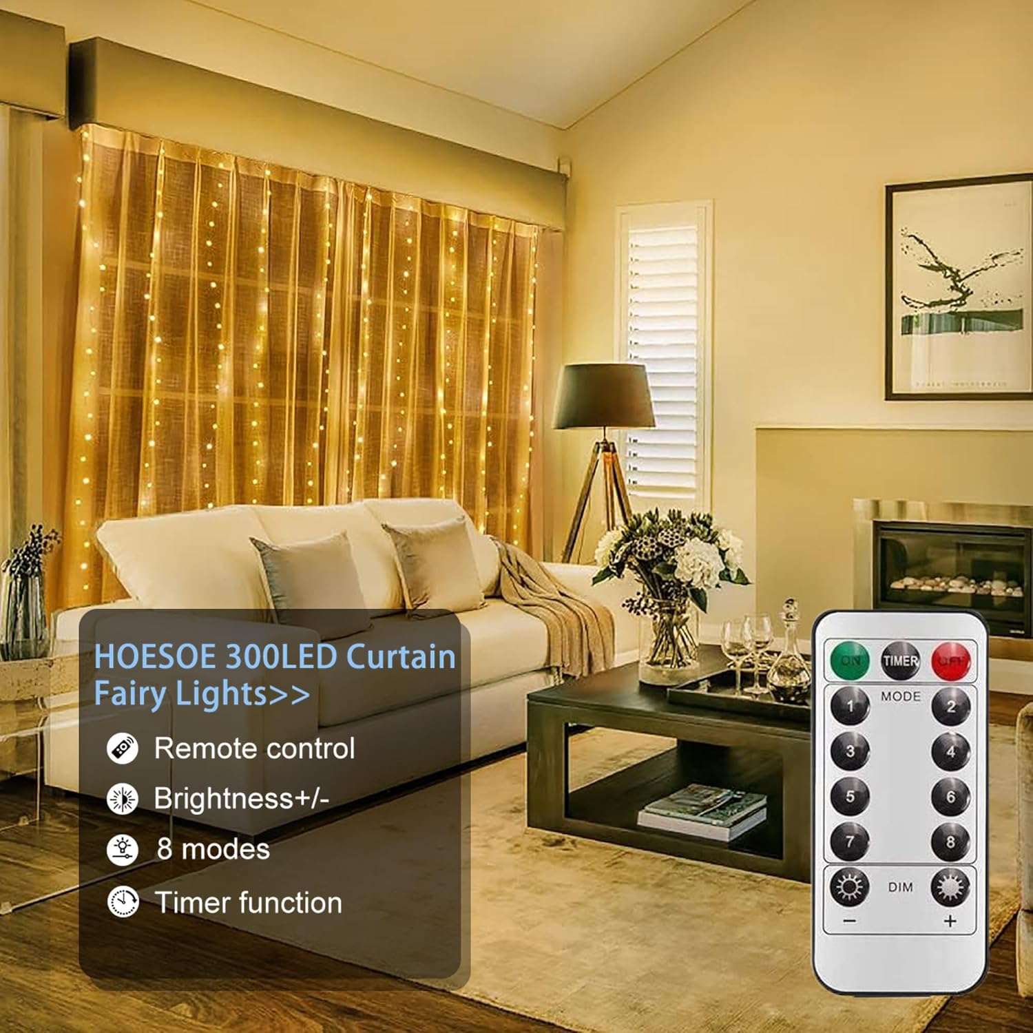 【3M x 3M Window Lights】:These lights for room decor equipped with 300 LEDs, 9.8ft x 9.8ft together with extra 6.5ft long lead cable and come with 10 strands which are sufficient to cover most windows and walls. The LED lights are bright to illuminate at night but will not flash to your eyes.