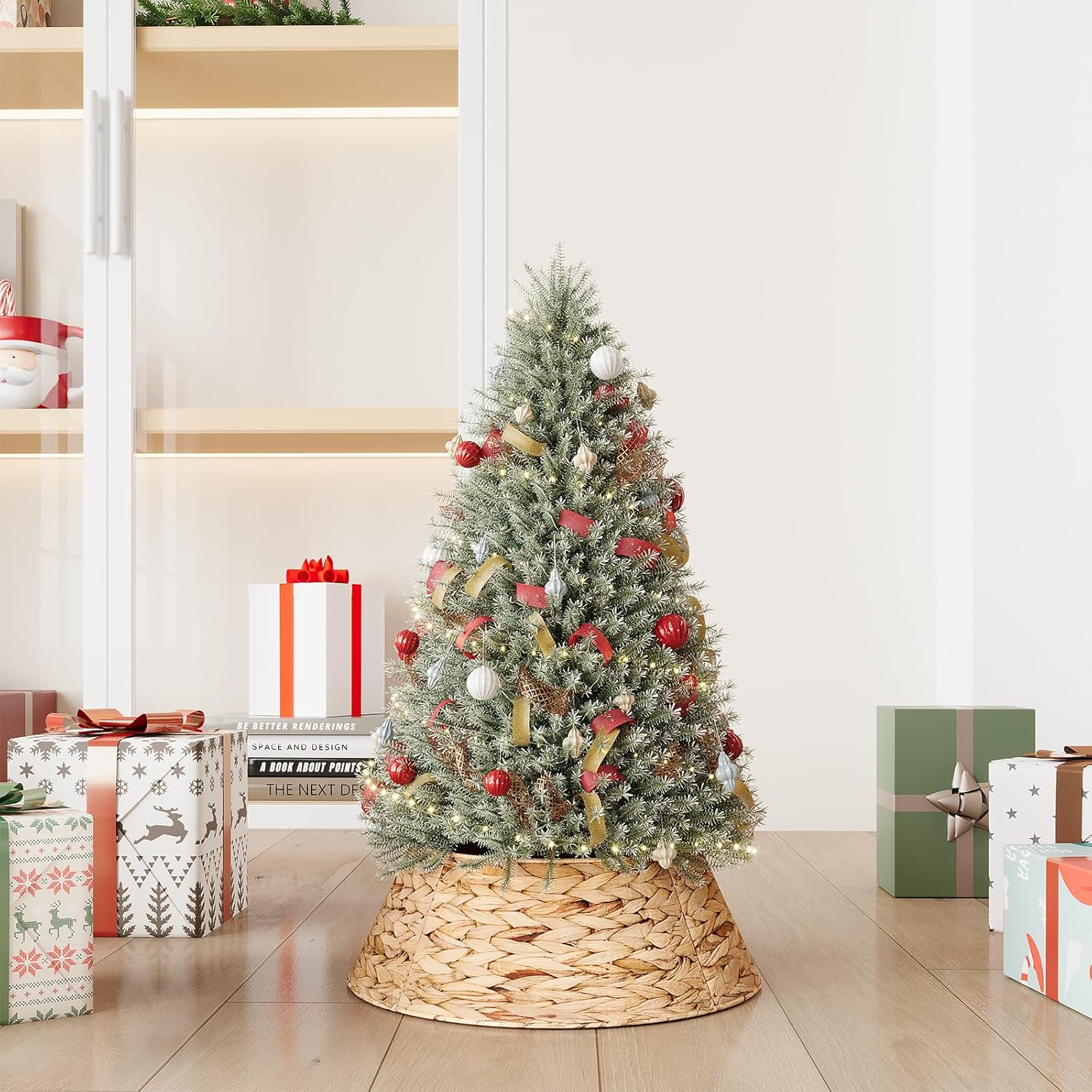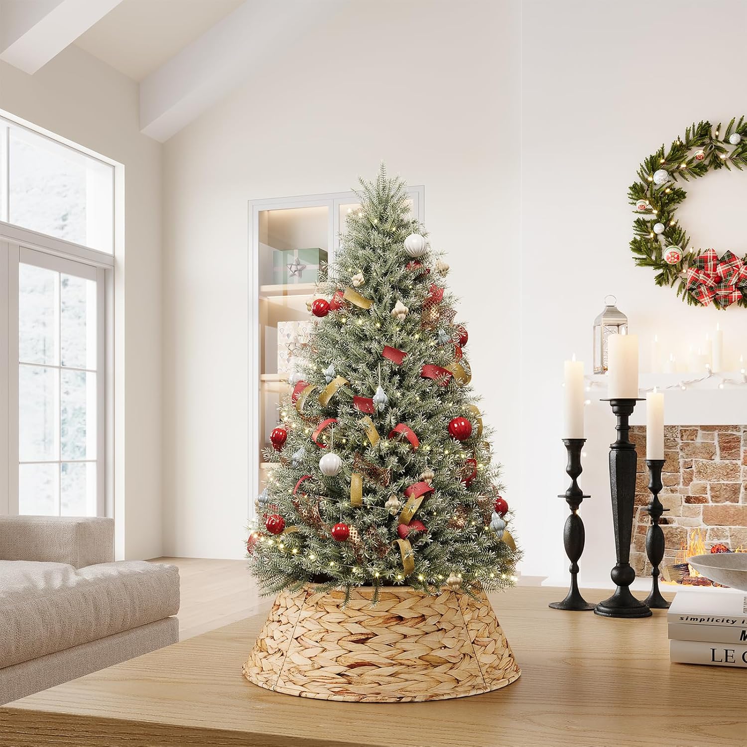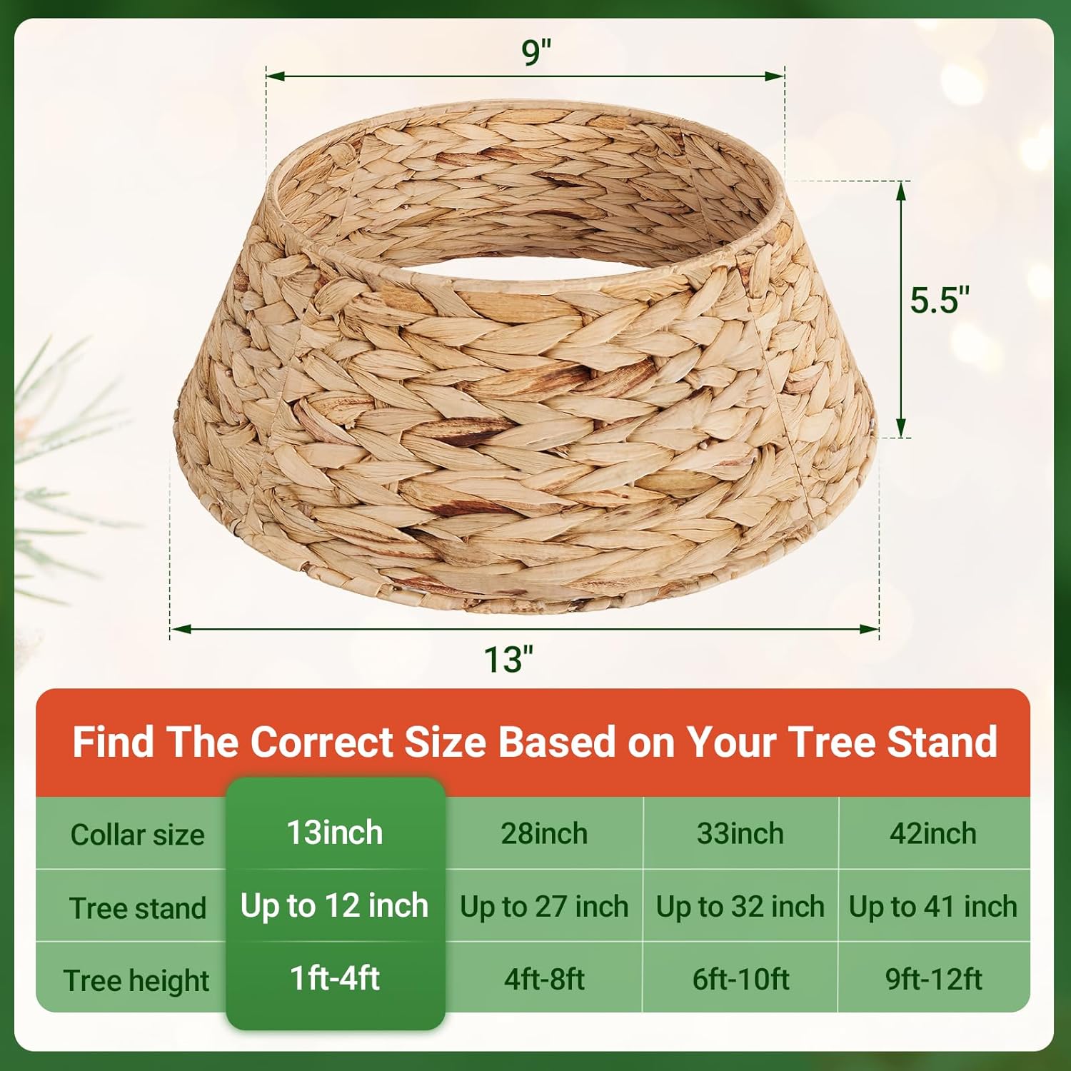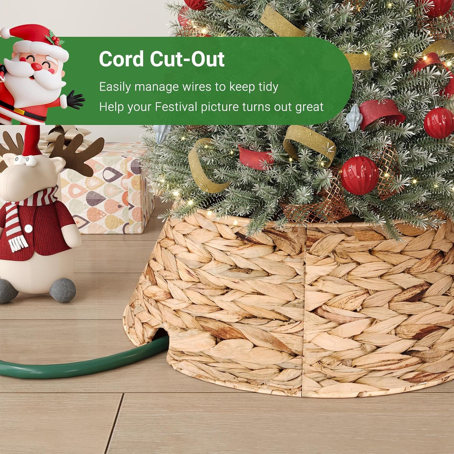 ELYKEN 13 Inch Mini Christmas Tree Collar, Stylish Hyacinth Tree Skirt for Artificial Trees, Rustic Farmhouse Wicker Tree Base Cover with Cord Cut-Out for Home Decor