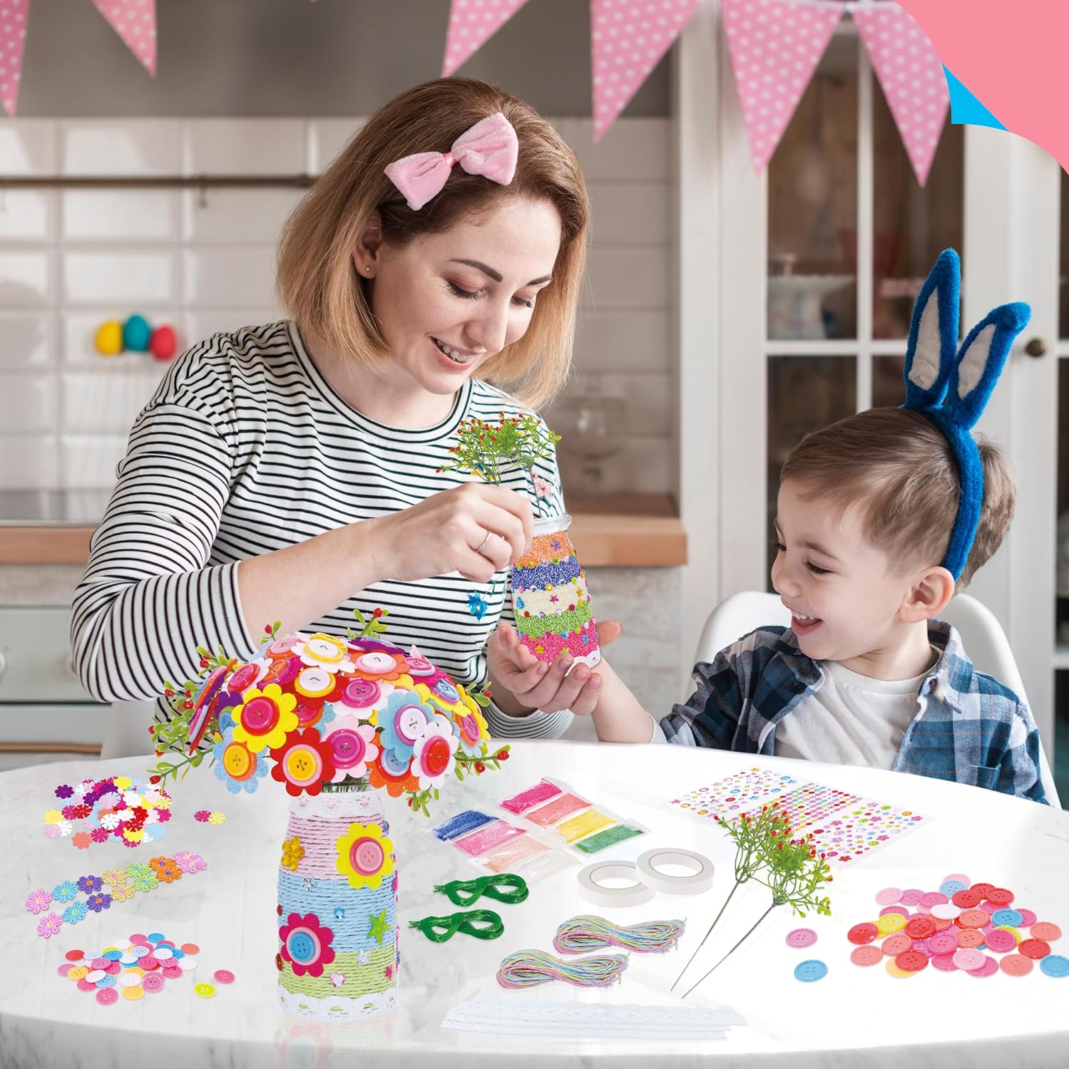 Flower Craft Kit for Kids, Make Your Own Flower Bouquet with Buttons and Colorful Petals, Art Vase and Craft DIY Activity Gift for Boys & Girls Age 4 5 6 7 8 9 10 Year Old (2 Glass Vase)
