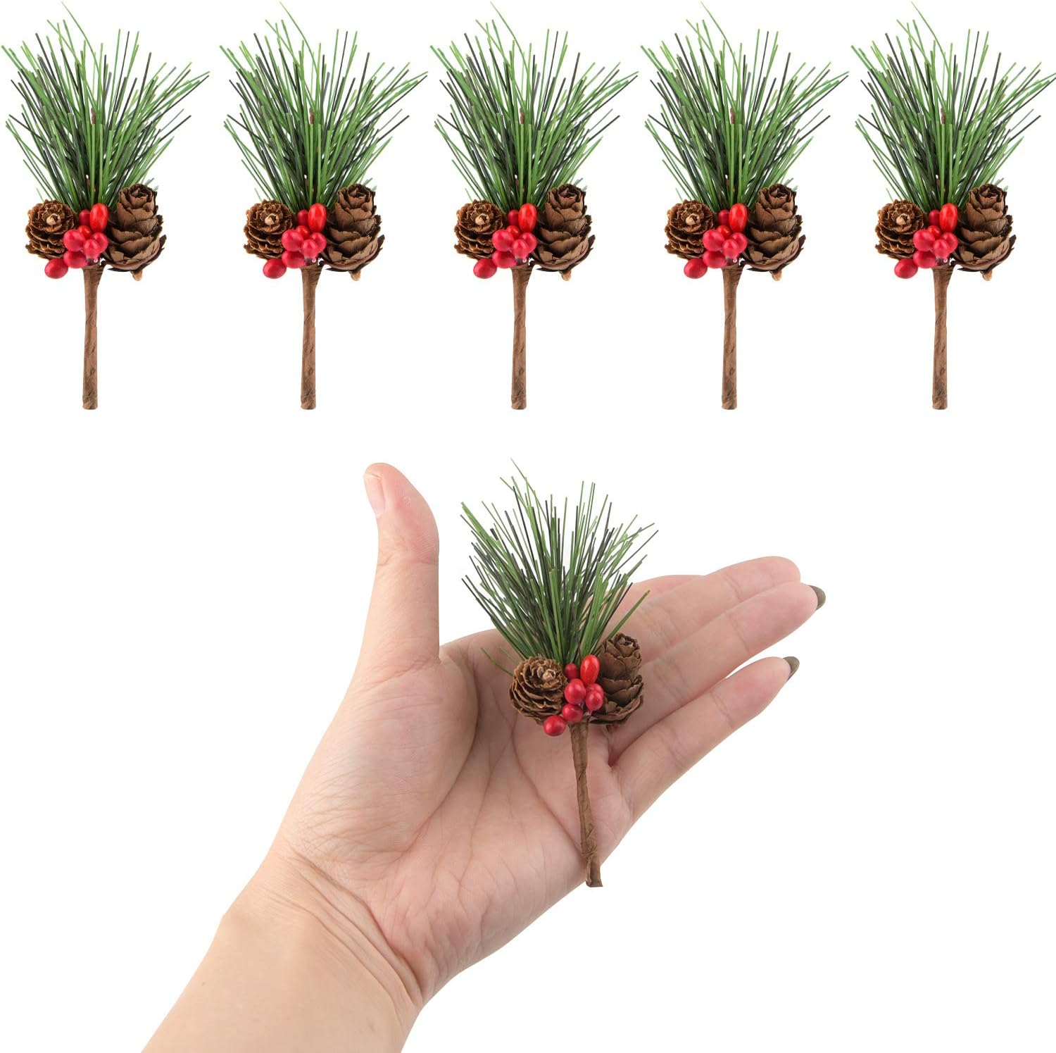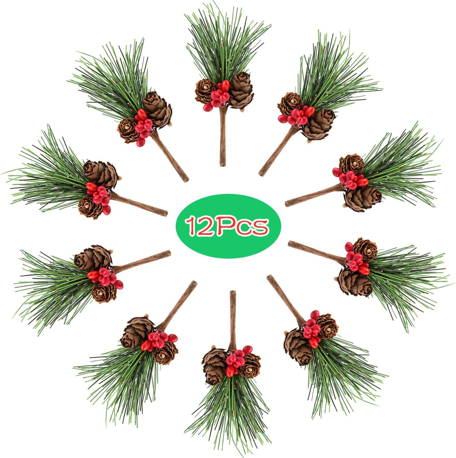 Package including: 12 PCS small artificial pine picks with holly berries and pine cones for Christmas crafts and wreaths decorations