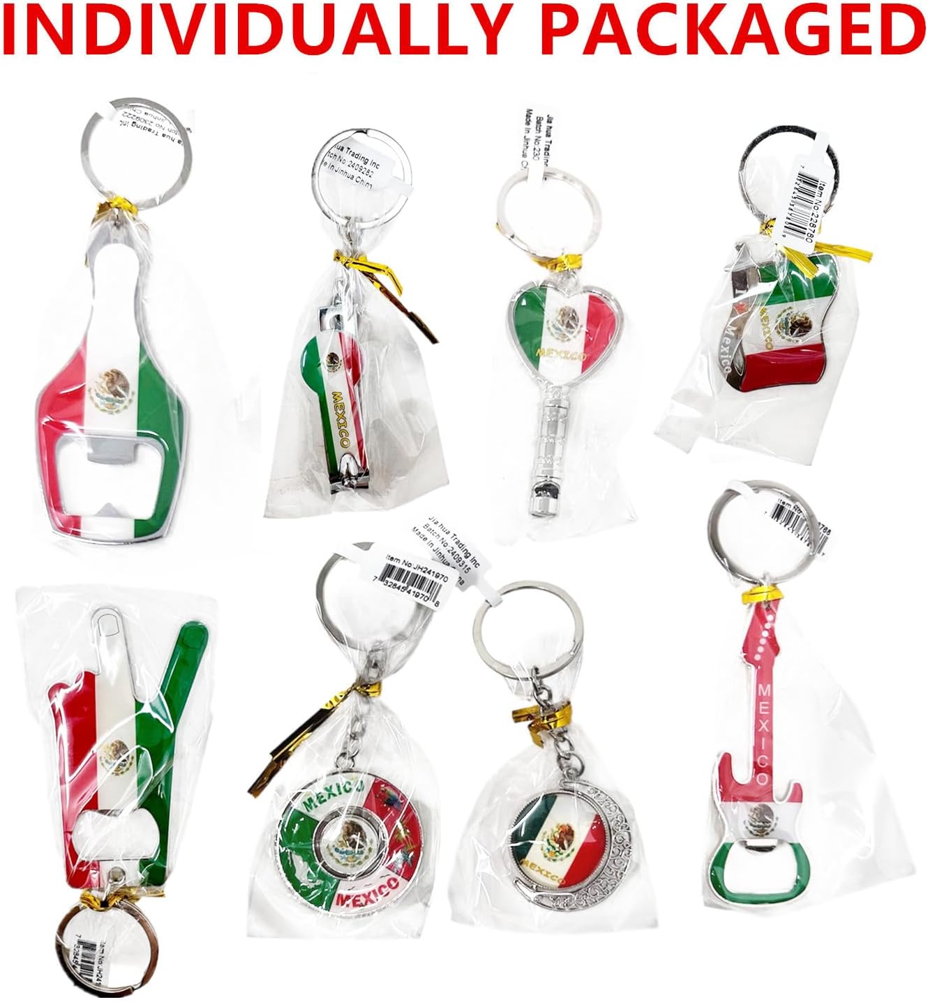 Introducing the Mexico Keychain Pack – a set of 8 stainless steel keychains, each boasting 3 bottle openers and a convenient nail clipper. Crafted for durability, these keychains feature a compact, lightweight design for easy portability. With a multifunctional bottle opener offering a corkscrew, foil cutter, beer opener, and Mexican flag keychain, it’s both practical and patriotic. Adorned with the vibrant flag of Mexico, it makes for an ideal souvenir or gift for any occasion, adding a unique touch to birthdays, holidays, or special events.