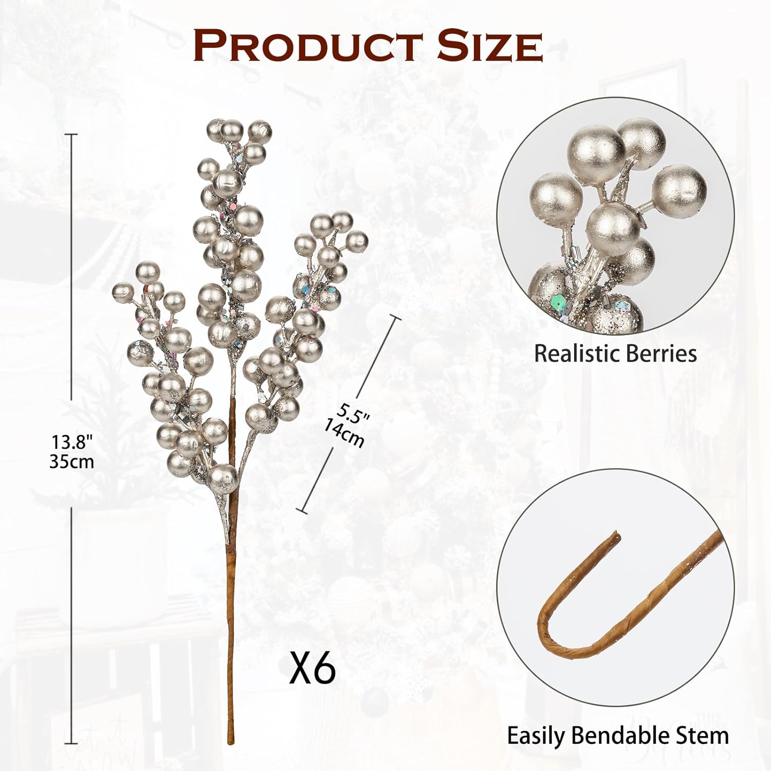 Premium Quality Material: Crafted from high-quality materials, these fuax berry stems are durable and long-lasting, ensuring they maintain their vibrant appearance throughout the holiday season and beyond. The bendable brown paper-wrapped wire stems are easy to adjust, straighten and reuse compared with plastic ones.