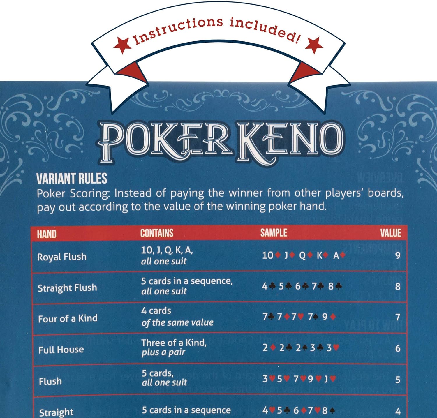 FULL HOUSE – Together time is important! Get the whole family together for a night of classic Poker Keno board games. Poker Keno and More Poker Keno bundle comes with 24 game boards, 2 decks of cards, and 400 bingo chips for game night!