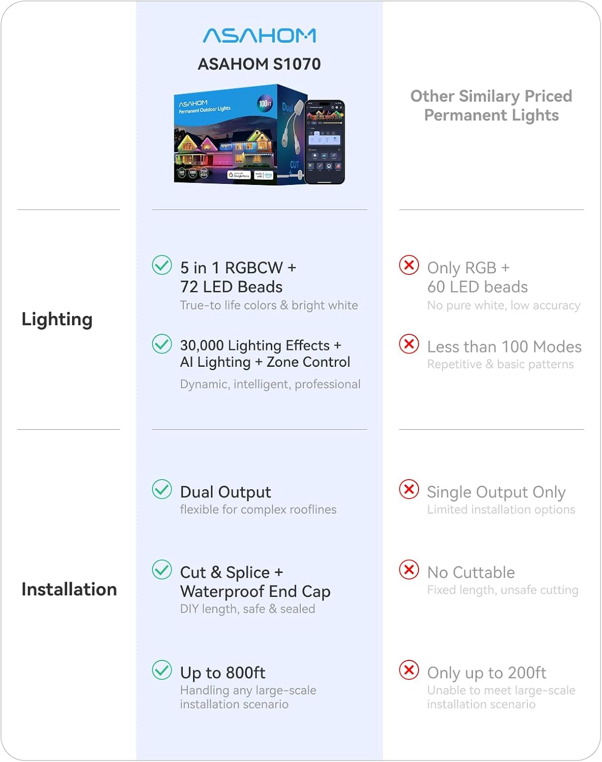 【Smart APP & Voice Control】Pair permanent outdoor lights with Alexa & Google Assistant for smart voice control. Use ASAHOM App to independently control each light, deliver warm white and cold white lights, set timer, cycle through different lighting effects, control the lighting speed, set light sequence and run 23 music modes for holiday party and accent lighting.