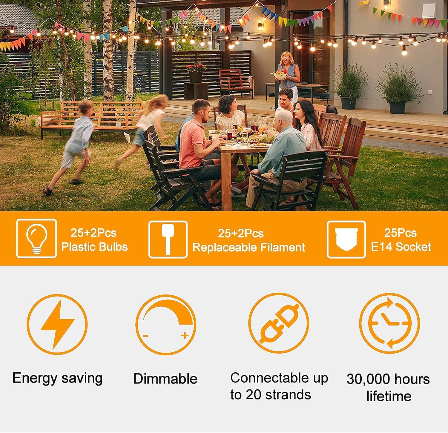 Energy Saving and Long Life: 25 FT ST38 bistro lights come with 12 bulbs and 1 spare bulb, 1W per bulb, the string light has an extra-long 30,000 hours long lifespan, which can reduce 98% electricity bills compared with incandescent bulbs